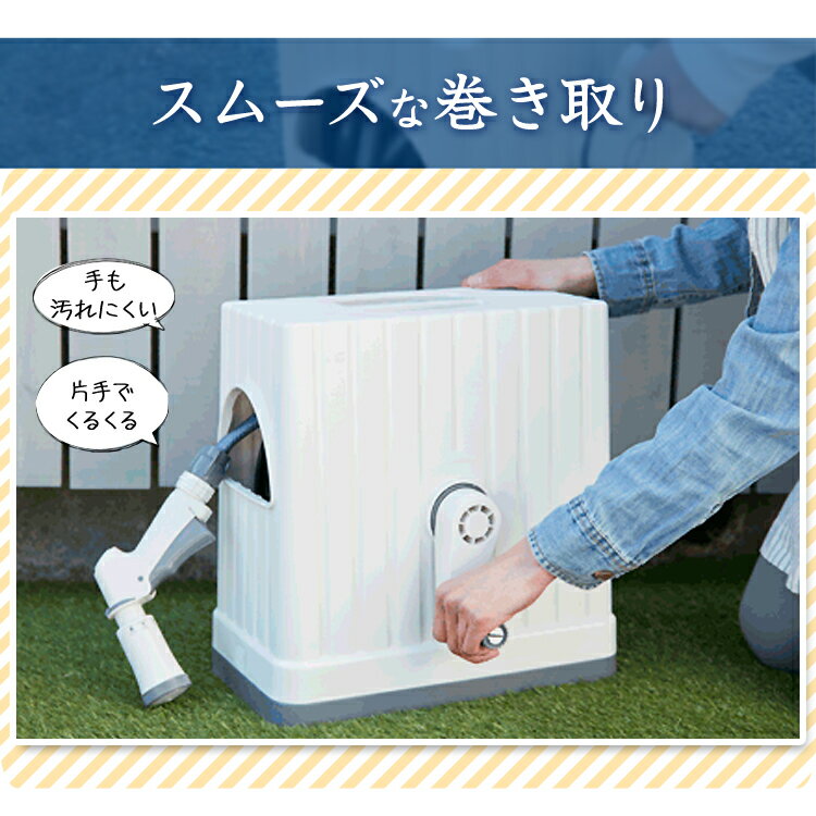 お庭に合うカラーリングと、シンプルなストライプ調デザインのホースリールです。 握った分だけ水が出る水量調整アクアガンと、耐圧糸入り・防藻機能付きホースを採用しています。 ●商品サイズ(cm):幅約34.5×奥行約40.5×高さ約41 ●重量:約6.09kg ●ホースサイズ:内径約12mm、外径約17mm ●適合蛇口外径:約14〜18mm ●水流パターン:キリ・ジェット・シャワー・ジョーロ・カクサン・ストップ ●材質 本体:ポリプロピレン、ABS樹脂 ホース:塩化ビニル樹脂 ガン:ABS樹脂、ポリカーボネート、ポリアセタール 最強翌日配送対象商品に関するご案内 最強翌日配送対象商品・対象地域に該当する場合は最強翌日配送マークがご注文カゴ近くに表示されます。 最強翌日配送可能なお支払方法は【クレジットカード、代金引換、全額ポイント支払い】のみとなります。 下記の場合は最強翌日配送対象外となります。 ・15点以上ご購入いただいた場合 ・時間指定がある場合 ・ご注文時備考欄にご記入がある場合 ・決済処理にお時間を頂戴する場合 ・郵便番号や住所に誤りがある場合 ・最強翌日配送対象外の商品とご一緒にご注文いただいた場合 ・お届け先住所文字数が40文字以上の場合★ご注文前のよくある質問についてご確認下さい★ ホースリールをキーワードから探す▶カットホース▶口金▶高圧洗浄機▶人工芝▶園芸機械