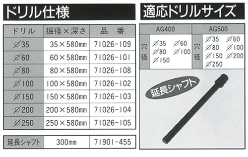 この商品と関連のある商品オーガードリル φ20mmオーガードリル φ25mmオーガードリル φ30mmオーガードリル φ40mmオーガードリル φ50mmオーガードリル φ60mmオーガードリル φ80mmオーガードリル φ150mmオーガードリル φ200mm【地域別運賃】オーガードリル φ250mmカーツ(KAAZ) オーガードリル φ100mmカーツ(KAAZ) オーガードリル φ100mmカーツ(KAAZ)のオーガー専用ドリルです。 【仕様】 ●適応機種: AG400/AG500/e-pro AG※メーカー直送品のため、欠品時には申し訳ございませんが 納期にお時間を頂く、もしくはキャンセルとさせて頂く場合がありますので御了承下さい。※商品改良のため、仕様・外観など予告なく変更する場合があります。 また画像と商品の色が若干異なる場合がありますのであらかじめ御了承下さい。注意事項届先名税込送料九州・本州・四国 送料無料北海道・沖縄(本島)・その他離島 配送不可・本製品は基本的には送料無料ですが、メーカーとの配送に関する取り決めの関係で北海道・沖縄・離島にはお届けできません。あしからず御了承ください。システムの都合上、ご発注時の送料表示額が異なる場合がございますが、受注処理後に訂正致しますので御了承下さい。・アクセス経路を4t車等の配送車両が余裕をもって通れない場合や、積み下ろし場所で往来を妨げずに作業できるスペースが確保できそうにない等、配送に難有と業者様に判断される場合にはお届けをお断りすることになりますが、あしからずご了承願います。・本製品は宅配便ではなく路線便での配送となります。原則として車上渡しとなりますので、御了承ください。・配送日や配達時間のご指定はお受けできません。・同一商品の複数同梱および他商品との同梱の場合は送料都度お見積りです。事前にお問合せください。・本製品に関しては初期不良等を除き、返品・交換共にお断りさせて頂いております。また弊社手配後はキャンセルもできません。ご了承の上、お選び下さいます様お願い申し上げます。注文について注意事項メーカー(提携先)からの直送となります。稀ではございますが欠品時は変動する場合もございますので、正確な納期はご注文の確認メールにてご案内させていただきます。