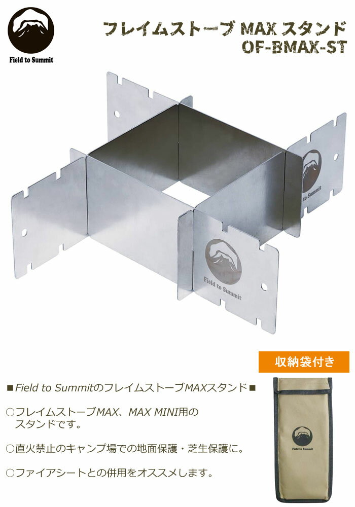 富士見産業 フレイムストーブ MAX スタンド OF-BMAX-ST フレイムストーブMAX MAX-MINI用富士見産業 フレイムストーブ MAX スタンド OF-BMAX-ST フレイムストーブMAX MAX-MINI用■Field to SummitのフレイムストーブMAXスタンド■○フレイムストーブMAX、MAX MINI用のスタンドです。○直火禁止のキャンプ場での地面保護・芝生保護に。○ファイアシートとの併用をオススメします。【仕様】●サイズ:プレート1枚W29×H10cm、厚み1.5mm、組立サイズ(約)W40xH10cm●重量:(約)プレート1枚318g●材質:ステンレス【付属品】●収納袋(ポリエステル)※製造工程によるキズ・ヘコミ等で、商品の使用に問題がないものは正常品です。※製品の仕様は予告なく変更することがあります。※製品には鋭利な部分があるため、取扱時は必ず厚手の軍手や革手袋等を着用してください。注文について注意事項複数ご注文時は数量により納期が変動する場合がございますので、正確な納期はご注文の確認メールにてご案内させていただきます。