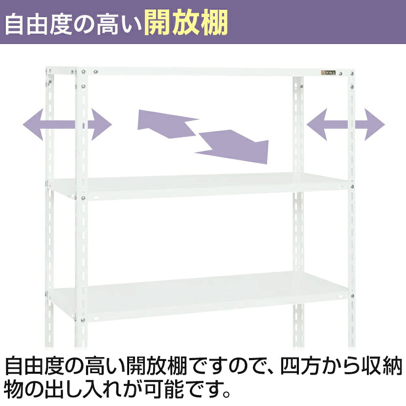 店舗用向きの明るいパールホワイトカラーのスチール棚 最上段・最下段の四隅にプレートを付けて強度を増し、四方から収納物の出し入れが出来る丈夫な開放棚。陳列する収納物に応じて棚板を増減・高さ50mmピッチで調整ができる自由度の高さが魅力のショップラックです。 ポイント 自由度の高い開放棚 自由度の高い開放棚ですので、四方から収納物の出し入れが可能です。 コーナープレートで強度バツグン 最上段・最下段の棚板四隅にコーナープレートを付けひずみを防止します。 棚板取付ピッチ 各棚板は、50mmピッチで自由に変えることができます。また棚板を追加することにより段数を増やせます。 樹脂製ベースキャップ 樹脂製ベースキャップ採用により、床に傷をつけにくくなっています。 商品サイズ 商品について サイズ幅1200×奥行450×高さ1500mm 耐荷重1段当り 最大80kg(均等耐荷重) 段数4段(棚板枚数) 付属品コーナープレート8枚付 生産国日本 備考樹脂製ベースキャップ標準装備※棚板は50mmピッチで段替え可能です。グリーン購入法適合商品 配送について 配送費用について配送費無料※北海道は1個あたり別途送料5500円(税込)※沖縄・離島は別途送料お見積り 組立についてお客様組立の商品です。 ご注意こちらの商品は車上渡し(配送トラックの荷台でのお引渡し)となります。