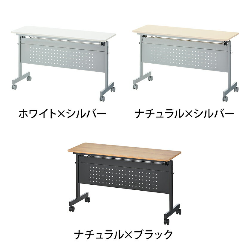 移動がラクラク!会議や研修に便利なフォールディングテーブル 片手でラクラク折りたためるフォールディングテーブルです。スタッキング収納対応なので、使わないときはコンパクトに片付けられます。キャスター付きで移動もラクラク。会議や研修に便利にお使い頂けます。 ポイント 片手でラクラク折りたためる 簡単レバーで、片手でラクラク折りたたむことが出来ます。 スタッキング収納対応 スタッキング収納対応なので、折りたためば使わない時コンパクトにしまっておけます(スタックピッチ140mm)。 足元が隠れる幕板付き 幕板がついており、座ったときに足元を隠すことが出来ます。 書類など置ける中棚付き 中棚に書類などを一時的に収納することが出来、机上スペースを確保しやすくなっています。 荷物を掛けられるフック付き 両サイドに5kgまでの荷物をかけられるフックがついています。(左右計2個) ストッパー付きキャスター キャスター脚なので移動がラクラク。設置が素早く行え、片付けも簡単です。座る側のキャスター2個にはストッパーが付いており、動かないよう固定することもできます。 選べる豊富なサイズバリエーション 幅は3サイズをラインナップ。1200mmは椅子2脚が入り、1800mmなら3脚が入ります。(※チェアのサイズによります)奥行は2種類をご用意しました(幅1500mmと幅1800mmのみ)。奥行450mmは机をたくさん必要とする際に適しています。奥行600mmは机上で作業を行うなど、広くスペースを必要とする場合に適しています。用途に合わせてお選びください。 イメージ 少人数から大人数までの会議や研修などに対応。スタッキングチェアを合わせれば、テーブル同様に収納が省スペースです。(※画像は幅1800mm・幕板ありの商品の参考写真です) ナチュラル×ブラックのカラーは、シックな雰囲気で落ち着いた空間を演出します。(※画像は幅1800mm・幕板ありの商品の参考写真です) 複数台を使用して、L字型やコの字型、口の字型レイアウトなど、様々なレイアウトが可能です。(※画像は幅1800mm・幕板ありの商品の参考写真です) 幕板なしのフォールディングテーブルは、対面式のレイアウトにすることで、大きめの会議テーブルとして活躍します。(画像は、幅1500・幕板なしの商品の参考写真です) カラーバリエーション 商品サイズ 商品について サイズ幅1500×奥行450×高さ705mm 材質天板:メラミン樹脂化粧板、パーティクルボード、エッジ:ポリプロピレン、脚:スチール(粉体塗装)、幕板:スチール(粉体塗装)、キャスター:ナイロン 重量26kg 構造天板:ソリッド 梱包数2 梱包サイズ幅1550×奥行500×高さ150mm 梱包重量25kg 必要工具六角レンチ(付属)、スパナ(付属)、プラスドライバー 組み立てお客様組立の商品です。 備考・折りたたみ式・フック付き(荷物掛け)・中棚付き・キャスター付き(2個ストッパー付き)・平行スタッキング可能 配送について 配送費用について法人様配送費無料個人様・沖縄・離島は別途送料。個人宅(法人名または屋号の記載がされていない)へのお届けには別途配送料が発生いたしますので、予めご了承ください。