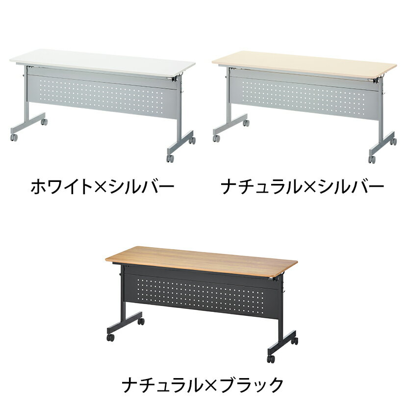 移動がラクラク!会議や研修に便利なフォールディングテーブル 片手でラクラク折りたためるフォールディングテーブルです。スタッキング収納対応なので、使わないときはコンパクトに片付けられます。キャスター付きで移動もラクラク。会議や研修に便利にお使い頂けます。 ポイント 片手でラクラク折りたためる 簡単レバーで、片手でラクラク折りたたむことが出来ます。 スタッキング収納対応 スタッキング収納対応なので、折りたためば使わない時コンパクトにしまっておけます(スタックピッチ140mm)。 足元が隠れる幕板付き 幕板がついており、座ったときに足元を隠すことが出来ます。 書類など置ける中棚付き 中棚に書類などを一時的に収納することが出来、机上スペースを確保しやすくなっています。 荷物を掛けられるフック付き 両サイドに5kgまでの荷物をかけられるフックがついています。(左右計2個) ストッパー付きキャスター キャスター脚なので移動がラクラク。設置が素早く行え、片付けも簡単です。座る側のキャスター2個にはストッパーが付いており、動かないよう固定することもできます。 選べる豊富なサイズバリエーション 幅は3サイズをラインナップ。1200mmは椅子2脚が入り、1800mmなら3脚が入ります。(※チェアのサイズによります)奥行は2種類をご用意しました(幅1500mmと幅1800mmのみ)。奥行450mmは机をたくさん必要とする際に適しています。奥行600mmは机上で作業を行うなど、広くスペースを必要とする場合に適しています。用途に合わせてお選びください。 イメージ 少人数から大人数までの会議や研修などに対応。スタッキングチェアを合わせれば、テーブル同様に収納が省スペースです。(※画像は幅1800mm・幕板ありの商品の参考写真です) ナチュラル×ブラックのカラーは、シックな雰囲気で落ち着いた空間を演出します。(※画像は幅1800mm・幕板ありの商品の参考写真です) 複数台を使用して、L字型やコの字型、口の字型レイアウトなど、様々なレイアウトが可能です。(※画像は幅1800mm・幕板ありの商品の参考写真です) 幕板なしのフォールディングテーブルは、対面式のレイアウトにすることで、大きめの会議テーブルとして活躍します。(画像は、幅1500・幕板なしの商品の参考写真です) カラーバリエーション 商品サイズ 商品について サイズ幅1500×奥行600×高さ705mm 材質天板:メラミン樹脂化粧板、パーティクルボード、エッジ:ポリプロピレン、脚:スチール(粉体塗装)、幕板:スチール(粉体塗装)、キャスター:ナイロン 重量29kg 構造天板:ソリッド 梱包数2 梱包サイズ幅1550×奥行650×高さ150mm 梱包重量28kg 必要工具六角レンチ(付属)、スパナ(付属)、プラスドライバー 組み立てお客様組立の商品です。 備考・折りたたみ式・フック付き(荷物掛け)・中棚付き・キャスター付き(2個ストッパー付き)・平行スタッキング可能 配送について 配送費用について法人様配送費無料個人様・沖縄・離島は別途送料。個人宅(法人名または屋号の記載がされていない)へのお届けには別途配送料が発生いたしますので、予めご了承ください。