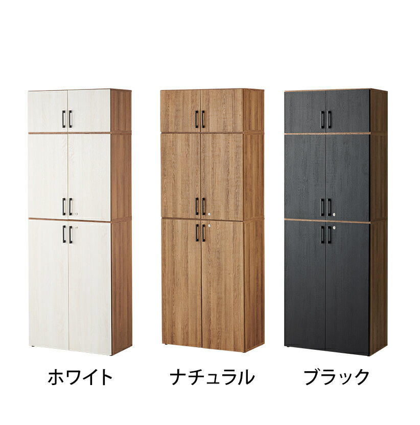 【シリーズ:レモダ 木製キャビネット】モダンなオフィスへ!収納力とデザイン性が高まる木製キャビネットセット オープンと扉付きを最大6段組み合わせて、収納力・統一感・デザイン性の高い収納空間が広がる木製キャビネット「Lemoda」の両開き棚セットです。A4に対応し、中棚の位置は5段階調整可能。扉はソフトクローズ機構を採用し、施錠管理できる鍵付きです。扉カラーは手触りまで本格的なホワイトとナチュラル(本体同色)、シックなブラックの3色。「機能性だけでなく、デザイン性も大切にしたい」という声にお応えする、モダンな収納シリーズです! ポイント お好みの組み合わせで、最大6段積み重ねられる! 1〜3段までのキャビネットを積み重ねて、最大6段の収納棚に!オープンと扉付きタイプをご用意しており、用途に合わせた組み合わせが可能です。積み重ねたキャビネットを横に並べれば、オフィス空間をデザインするコーディネートを展開できます(4段以上連結する場合は必ず壁面に設置してください)。 A4ファイルがすっぽり 棚はA4サイズに対応し、横型ボックスファイルもすっぽり収まります。オフィス収納に適した奥行きです。 収納物に合わせて調整できる可動棚 棚板は収納物に合わせて5段階調整できるので、用途に沿った使い方が可能になります。 手触りまで本格的な木目調デザイン 木目の美しさが際立つ表面は、手触りも本格的。目でも触り心地でも、温もりや風合いを実感していただけます。 ボルト固定で上下連結 積み重ねた際は、ボルトで上下を連結してご使用ください。しっかり固定できるので、上置きキャビネットの安定性が向上します。 しっかり握れるコの字型取っ手 取っ手の形状は、手にフィットして開閉しやすいコの字型。上置き用は下側、下置き用は上側と、アプローチしやすい位置になっています。 鍵付き扉でセキュリティ性アップ セキュリティ面を考慮して保管したい場合は、施錠管理できる鍵付き扉がオススメです。 扉が静かに閉まるソフトクローズ機能 軽い力でゆっくり閉じるソフトクローズ機構の扉を採用。衝撃音や扉のバウンドを防ぎ、枠を傷付けません。 アジャスター付き 底面にアジャスターが付いており、床に対して水平にアジャストできます。 ※組み立てについて バリエーション 商品サイズ 商品について セット内容1段扉付き×1、2段扉付き×1、3段扉付き×1 サイズ(全体)幅800×奥行443×高さ2204mm 重量(全体)66.7kg ■1段扉付き■■詳細■ サイズ幅800×奥行443×高さ366mm 重量本体 / 9.2kg扉 / 3.24kg 耐荷重(等分布)天板・棚板 / 25kg 材質本体・扉 / 強化紙化粧板、フラッシュ構造、パーティクルボード(天板、底板ハニカム構造) 梱包数2箱 梱包サイズ(約)梱包1(本体) / 幅975×奥行450×高さ80mm梱包2(扉) / 幅590×奥行445×高さ63mm 梱包重量梱包1(本体) / 10.28kg梱包2(扉) / 3.92kg 付属品転落防止用部材1セット ■2段扉付き■■詳細■ サイズ幅800×奥行443×高さ732mm※アジャスター使用時 / 740mm 重量本体 / 16.88kg扉 / 5.48kg 耐荷重(等分布)天板・棚板 / 25kg 材質強化紙化粧板、フラッシュ構造、パーティクルボード(天板、底板ハニカム構造) 梱包数2箱 梱包サイズ(約)梱包1(本体) / 幅915×奥行450×高さ125mm梱包2(扉) / 幅960×奥行445×高さ63mm 梱包重量梱包1(本体) / 18.18kg梱包2(扉) / 6.42kg 付属品転落防止用部材1セット ■3段扉付き■■詳細■ サイズ幅800×奥行443×高さ1098mm※アジャスター使用時 / 高さ1106mm 重量本体 / 24.18kg扉 / 7.68kg 耐荷重(等分布)天板・棚板 / 25kg 材質強化紙化粧板、フラッシュ構造、パーティクルボード(天板、底板ハニカム構造) 梱包数2箱 梱包サイズ(約)梱包1(本体) / 幅1180×奥行450×高さ140mm梱包2(扉) / 幅1325×奥行445×高さ63mm 梱包重量梱包1(本体) / 25.94kg梱包2(扉) / 8.94kg 付属品転落防止用部材1セット ■備考■※両開き扉付き(2段・3段鍵付き、ソフトクローズ機構付き)※1段の扉には鍵は付いておりません。※アジャスター付き(上置き使用時 / アジャスター取付不要)※最大6段まで連結可能 変更点・扉カラー:ブラック:木目なし ⇒ 木目あり(シボ加工) に変更(変更日:2025年10月15日) ご注意4段以上連結する場合は必ず壁面に設置してください。 配送について 配送費用について法人様配送費無料個人様・沖縄・離島は別途送料。個人宅(法人名または屋号の記載がされていない)へのお届けには別途配送料が発生いたしますので、予めご了承ください。 組立についてお客様組立の商品です。※必要工具 / 六角レンチ(付属)、プラスドライバー