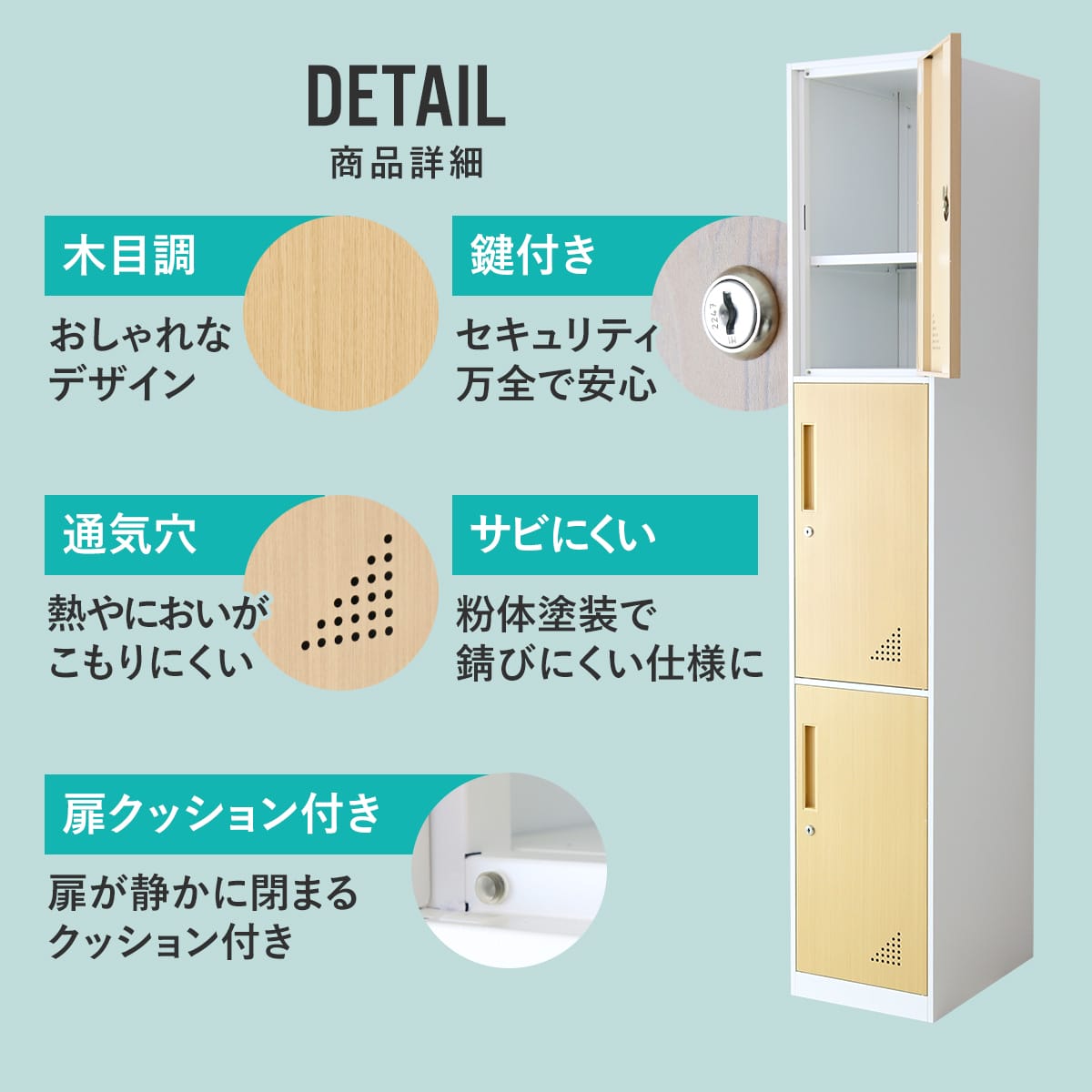 【クーポン20%off 12/4 20時〜24時】 ロッカー 3人用 おしゃれ 収納 スリム 1列3段 スチールロッカー 更衣ロッカー スチール 鍵付き 棚付き 鏡付き 木目調 棚付き ポール付き 更衣室 棚 棚板 オフィス 会社 事務 事務所 病院 施設 スリム ミオ1列3扉 ドリス