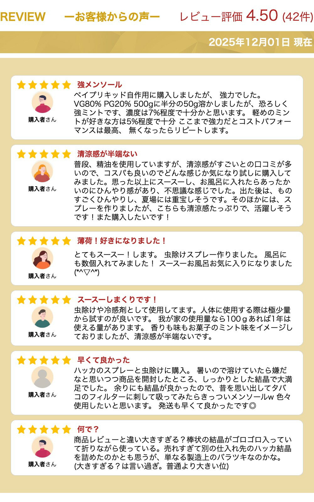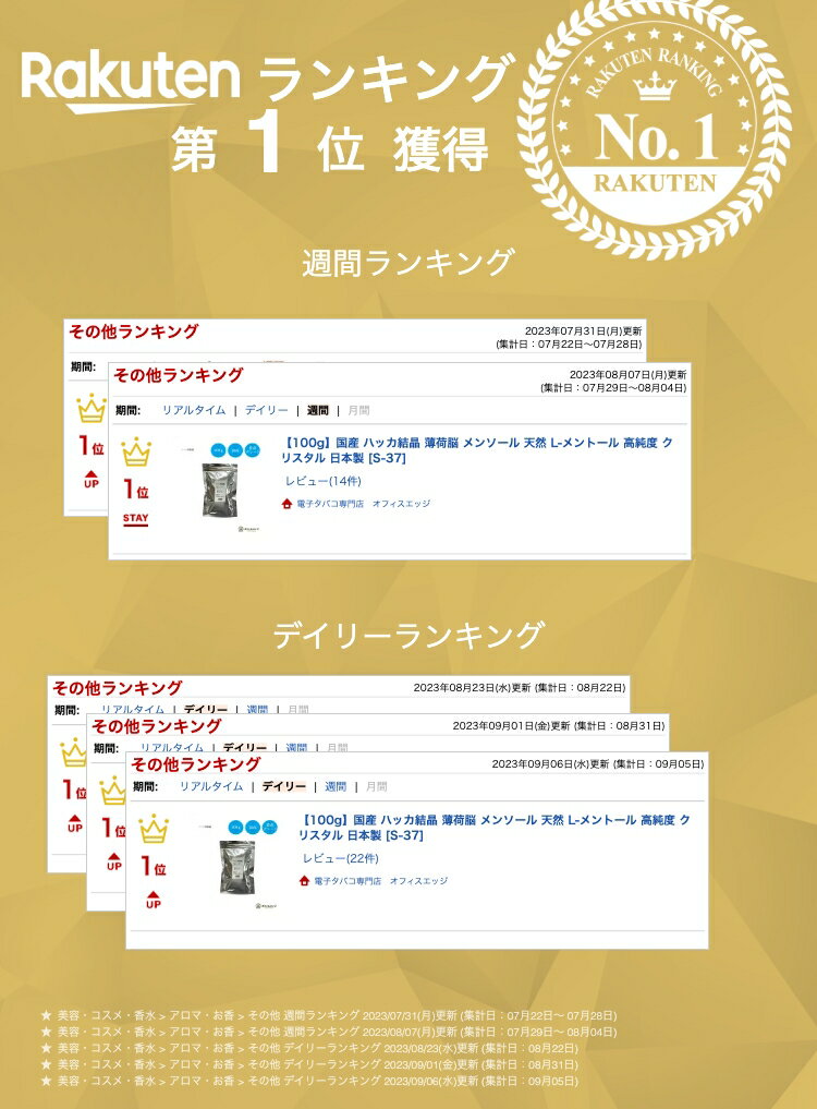 内容量100g 国産天然100% 安心・安全の日本製造 L-メントール vapeリキッド自作に。 アロマや入浴剤のDIYにも またむしよけや消臭効果にも。 【ご注意】 ハッカ結晶の融解温度は 42〜45℃程度となります。 配達場所の環境によっては 結晶状態から溶けてしまう恐れがありますので 予めご注意くださいませ。 ロットによっては商品パッケージが画像と若干 異なる場合がございます。 ↓お徳用200gはこちらから ↓大容量500gはこちらから 関連商品【500g】国産 ハッカ結晶 薄荷脳 メンソール 天然 L-メントール...キック感プラス! Nevoks Bar C800 持ち運びシーシャ ニ...【200g】国産 ハッカ結晶 薄荷脳 メンソール 天然 L-メントール...5,980円1,200円2,350円Ultima -零 ゼロ- アルティマゼロ 合計60ml容量 30m...【シリンジボトル付き】エッジの無限メンソールリキッド 150ml メン...vape 本体 hinic ハイニック ハイニク 本体 HILIQ H...1,200円1,100円1,100円フラットレジンドリップチップ 【810規格】ベイプ 電子タバコ 吸い口...【810規格】16穴エアーホールドリップチップ ベイプ 電子タバコ 吸...Q14 Q16 Q16PRO コイル JUSTFOG Compact1...1,100円1,100円1,300円CE4アトマイザー◇5本セット◇ Clearomizer CE4 電子...【2個セット】 BFスコンカー用シリコン製ボトル coilmaster...Kangertech MT-32 Coil MT32 5個入り 交換...1,300円1,280円1,100円