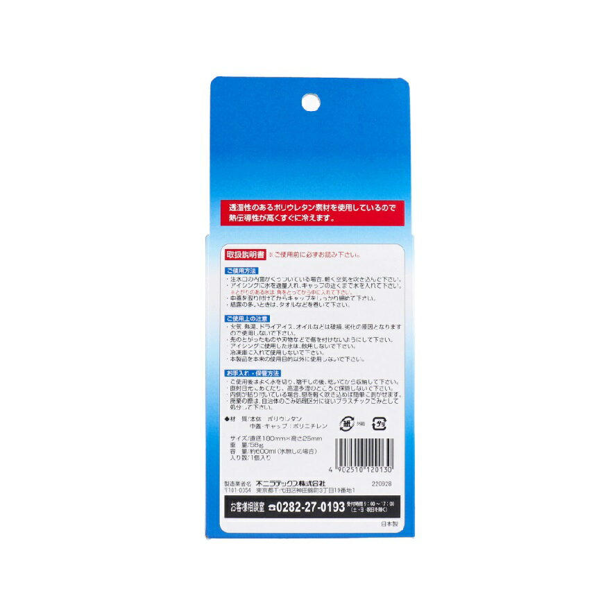商品情報サイズ・容量個装サイズ:90X200X45mm個装重量:79g内容量:1個入製造国:日本【発売元:不二ラテックス株式会社】規格【材質】本体・・・ポリウレタン中栓、キャップ・・・ポリエチレン【サイズ】直径180mmX高さ25mm【容量】約600mL(氷無しの場合)【ご使用方法】・注水口の内面がくっついている場合、 軽く空気を吹き込んで下さい。・アイシングに氷を適量入れ、キャップの近くまで水を入れて下さい。※とがりのある氷は、角をとってから中に入れて下さい。・中蓋を取り付けてからキャップをしっかり締めて下さい。・結露の多いときは、 タオルなどを巻いて下さい。【注意事項】・火気、熱湯、ドライアイス、オイルなどは破損、劣化の原因となりますので使用しないで下さい。・先のとがったものや刃物などで傷を付けないようにして下さい。・アイシングに使用した氷は、飲用しないで下さい。・冷凍庫に入れて使用しないで下さい。・本製品を本来の使用目的以外に使用しないで下さい。・ご使用後はよく水を切り、陰干しの後、乾いてから収納して下さい。・直射日光にあてたり、高温多湿のところで保管しないで下さい。・内側が貼り付いている場合、息を軽く吹き込めば簡単に剥がせます。・廃棄の際は、自治体のごみ処理区分に従いプラスチックごみとして処分して下さい。広告文責株式会社Office Kenna TEL:082-847-2414【ポイント10倍キャンペーン当店バナーよりエントリー必須】【選べる1・2・3個セット】ひえぷる アイシング 氷のう 冷却アイテム 持ち運びアイシング 冷却材 ポリウレタン素材のハイテク氷のう! 商品説明 冷却伝導性の高いポリウレタン素材!●柔らかくしっとりとした肌ざわり。●クリアで中身が見え、臭いがしない。●市販サポーターとの併用対応。●コンパクト収納で携帯に便利。●こんな時に・急な発熱・歯痛に・打ち身・捻挫・打撲に・スポーツ後のクールダウンに※予告なく成分・パッケージが変更になることがございます。予めご了承ください。 1