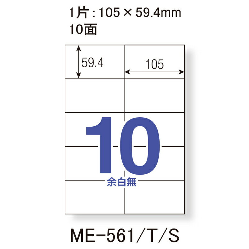 メーカー希望小売価格はメーカーカタログに基づいて掲載しています※こちらの商品は受注発注商品の為、ご注文後3〜5営業日後の出荷予定となります。※メーカー在庫切れの為1週間以内に出荷できない場合はメールにてご案内させていただきます。◆主な特長★段ボールやA4封筒、紙袋などの大きめサイズに適したラベルです。★台紙(裏紙、はく離紙)はリサイクルできるように樹脂ラミネート加工のない紙を使用しています。★様々なプリンターで共用でき、手書きもOKです。※四方に余白がない面付ですので、用紙の端にあたる片では、印字できない領域があり、デザインが制約されます。◆商品仕様商品名いつものラベル 収納・案内用ラベル A4 500枚入 2×5片付10面 ME-561Sメーカー品番ME-561S注文コード48-912JAN4977564609696規格・寸法★規格:A4★外形寸法:A4(297×210mm)★面付:2×5片付10面★数量:500材質★総厚:124μm(0.124mm)、ラベル厚:71μm(0.071mm)★ラベル坪量:70g/m2