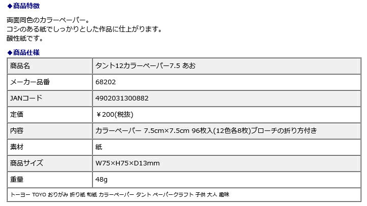 ◆トーヨー 両面同色折紙タント12 カラーペーパー 7.5×7.5 各種あかあおきみどり※こちらの商品は在庫商品の為、ご注文後2〜5営業日後の出荷予定となります。◆商品特徴両面同色のカラーペーパー。コシのある紙でしっかりとした作品に仕上がります。酸性紙です。◆商品仕様商品名タント12カラーペーパー7.5 あおメーカー品番68202JANコード4902031300882定価¥200(税抜)内容カラーペーパー 7.5cm×7.5cm 96枚入(12色各8枚)ブローチの折り方付き素材紙商品サイズW75×H75×D13mm重量48gトーヨー TOYO おりがみ 折り紙 和紙 カラーペーパー タント ペーパークラフト 子供 大人 趣味※こちらの商品はゆうパケット(メール便)での発送(送料 290円)が可能です。 ご希望の際は、配送方法を「メール便」に変更してください。※ゆうパケット(メール便)を選択された場合は下記注意事項を全てご了承いただけたものとします。 ◆ゆうパケット(メール便)での出荷についての注意事項◆配送日時指定について ご注文の際に配送日時指定がございましたら通常の宅配便にて発送させて頂きます。 送料につきましては通常料金が適応されます。(3980円(税込)以上のご購入で無料です) 但し通常発送の場合でもお届けは最短納期以降になります。ゆうパケット(メール便)対象商品以外との同梱につきまして ゆうパケット(メール便)対象商品以外との同梱で規格サイズ(梱包資材を含めA4サイズ厚さ20mm以下)を超える場合は通常の宅配便での発送となります。 送料につきましては通常料金が適応されます。(3980円(税込)以上のご購入で無料です)代金引換でのお支払いにつきまして ゆうパケット(メール便)での配送の場合は代金引換がお使い頂けません。 代金引換でのお支払いをご希望される場合は通常の宅配便をご指定ください。 送料につきましては通常料金が適応されます。(3980円(税込)以上のご購入で無料です)高額注文につきまして 1回のご注文で他の商品も含め3980円(税込)以上ご購入いただいた場合は送料無料で発送させて頂きます。(メーカー直送商品除く)配送方法のご指定につきまして 「ご購入手続き」の際の配送方法を「メール便」にご変更ください。梱包形態・お届けにつきまして 梱包は簡易包装となります。(一般的な茶封筒です)。 出来るだけしっかり梱包いたしますが規格サイズを超えないようにするため十分ではない場合がございます。 ご注文の数量により複数個口となる場合がございます。その場合の送料は個口× 290円となりますのであらかじめご了承下さい。 また複数個口の場合で宅配便の送料を超える場合は宅配便での出荷に変更させて頂きます。 ゆうパケット(メール便)での発送の場合配送中の曲がり・汚損及び投函後の紛失等があった場合でも商品につきましては補償できませんのであらかじめご了承ください。ゆうパケット(メール便)のお届け日数予定 ・沖縄以外の九州及び山口県:発送後翌々日のお届け予定 ・上記以外のエリア:発送後約3日後のお届け予定 ※離島及び山間部等の一部地域はさらに日数が必要となります。 ※交通機関の乱れによる配送遅延につきましては補償できかねますのであらかじめご了承下さい。