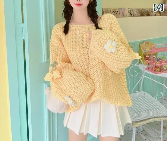 ニット レディース 春秋 韓国風 かわいい 立体 花柄 ゆったり 長袖 トップス プルオーバー ラウンドネック カジュアル デイリー 普段使い イエロー