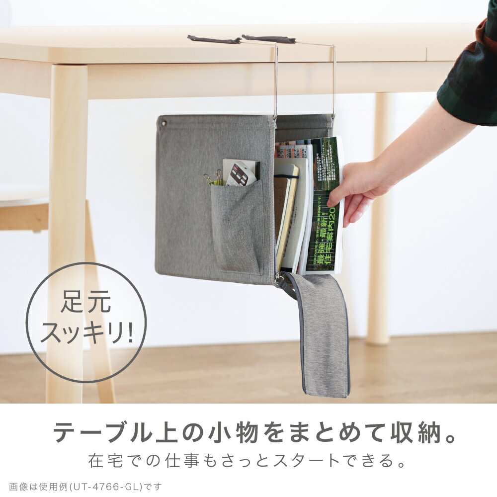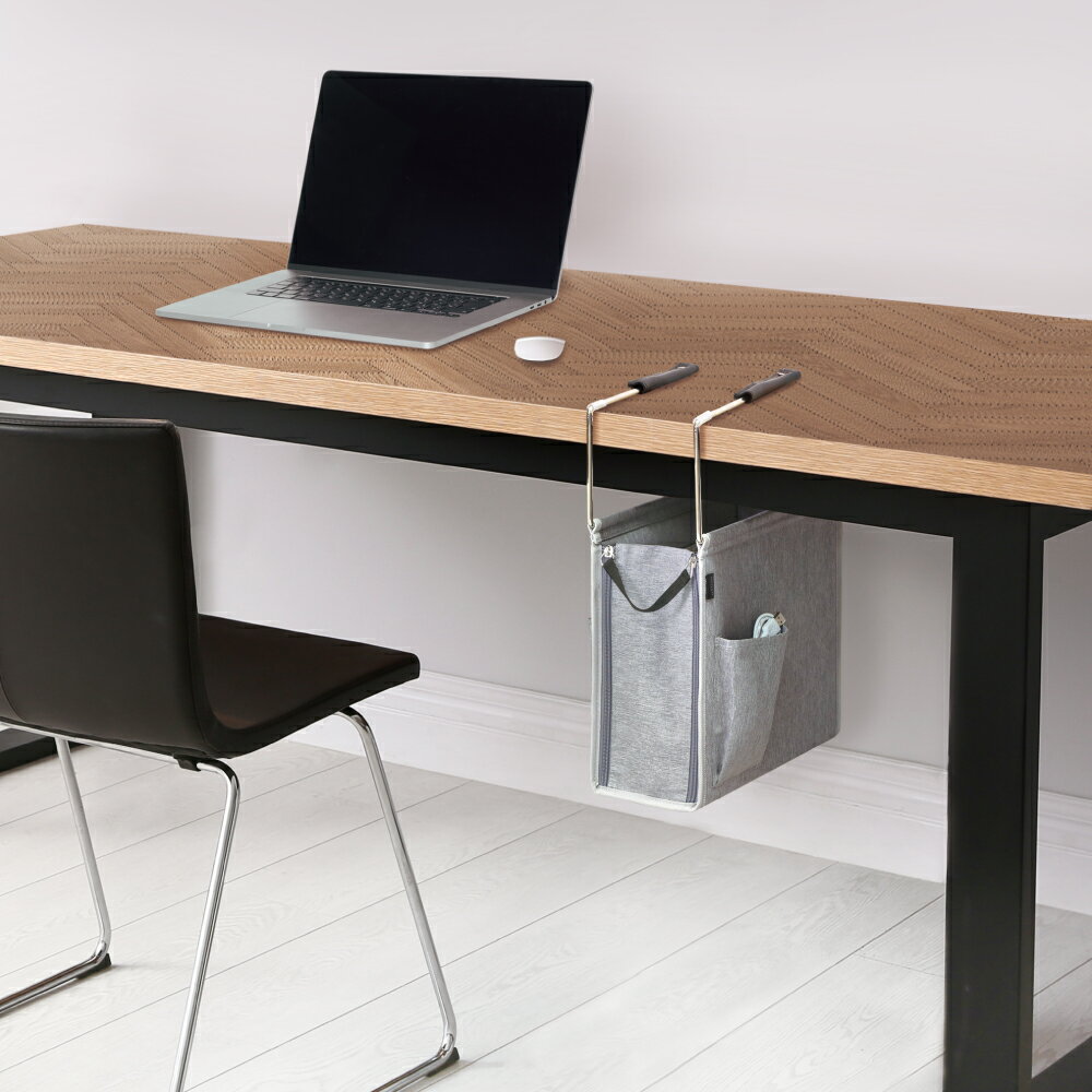 ダイニングテーブルやデスクに取り付けるだけ、どこでも収納スペースが確保できる。机の上や足元はスッキリ! リモコン、郵便物など、ダイニングテーブル上の小物をまとめて一時収納、自分のデスクのないお家でも、さっとお仕事スタート。 ハンガー部分を持って荷物を入れたままの持ち運びが可能で、お家のクローゼットや、職場のロッカーに収納・保管可能。 A4サイズの書類やファイルの収納にぴったり。最大14インチのノートPC・タブレットも入ります。 使わないときはたたんで薄型に。場所を取らずに収納できます。 外側にポケットが2つついており、マウスやケーブルやペンなどの小物を分けて収納できます。 耐荷重約4kgf。 主要材質=ポリエステル・紙・スチール 商品:360×280×130mm 内寸:約330×250×110mm パッケージ:265×370×40mm