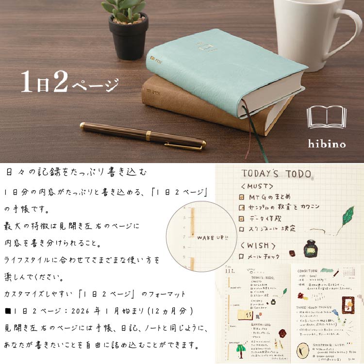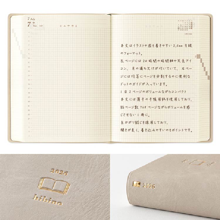 商品名 ダイアリー hibino<A6> ブルーグリーン 内容 年間カレンダー、フューチャーログ 月間スケジュール(2025年12月~2027年1月※14ヵ月分) 1日2ページ(2026年1月~2026年12月※12ヵ月分) メモ(4ページ) 表紙 PVC製 ページ数 768ページ サイズ パッケージ/H163×W123×D30mm 本体/H152×W115×D27mm 重量 331g 仕様 糸かがり綴じ、しおりひも2本付 原産国 MADE IN JAPAN 備考 ●こちらの商品の異なるタイプ(4月始まり、9月始まり、日曜始まりなど)の発売予定はございません。 ●国民の祝日・休日などは、2025年2月3日発表の官報に基づいています。その後の、法改正にともない、変わる場合があります。 2.5mm方眼の月間ブロックページ ■月間ブロック :2025年12月始まり(14ヵ月分) シンプルな月間ブロックのページは前半に付いています。余白にも自由にメモなどを書き込みやすくなっています。 1年を俯瞰できる年間カレンダーと各月の予定や目標を書き出せる12ヵ月分のフューチャーログが付いています。 金箔のロゴが映える上品なデザインの表紙 柔らかな革のエンボスが入った表紙に、金色の箔押しが施されています。風合いのある上品な佇まいで、大切な記録を残すのにぴったりな1冊です。
