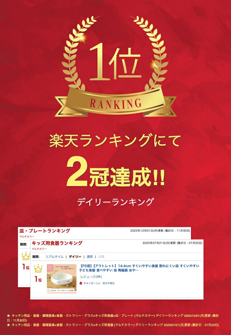 商品説明サイズ口径:約14.4cm高さ:約4.3cm 容量:約470cc※材質の特性上、寸法に若干の誤差が生じることがございます。材質強化磁器 色・絵柄【さふぁり】商品説明 保育の先生方のお声から生まれた、 すくいやすさにこだわった内側に返しのあるお皿です。収納に嬉しい積み重ねのできる形状になっています。 子どもの「自分で食べたい!」という気持ちを応援する食器。自分で食べられる達成感によって食事の時間が楽しくなります♪まだスプーンを使うことに慣れていない子にとって 「返しがあることはもちろん、スプーンですくうスペースに余裕がある方が、よりすくいやすくなる。」と保育の先生から聞いたことがあります。 年齢・食べられる食事量・盛り付けたい料理などに合わせてサイズを選ぶことをおすすめします! 大きめのサイズのお皿は、カレーライスなどスプーンを使う料理だけでなく、料理を盛り合わせる、ワンプレートとしても最適です。※14.5cmのほかに、17cm、12.5cm、11.5cm、9cmのすくいやすいお皿があります☆ぜひこちらもご覧ください♪ ※モニターの発色具合によって実際のものと色が異なる場合がございます。取り扱いについてより長く安心してお使いいただくために。ーーーご使用上の注意ーーー ▼強化磁器は一般の磁器と比べて割れにくい材質ですが、土から作る焼き物なので、衝撃が加わると割れてケガをする恐れがあります。 ▼およそ1250℃の高温の窯で焼いて作られるので、熱に非常に強いですが、直火ではお使い頂けません。 ▼電子レンジ・オーブン(直火不可)・食器洗浄乾燥機は使用できます。各機器の注意表記を十分にお読みのうえ、正しい方法でお使いください。 ▼長期間金属製のスプーンフォークなどで食器を強く擦ると、表面にキズがつきメタルマークが取れなくなることがあります。ーーーお手入れの方法ーーー ▼やわらかいスポンジをお使いください。金属たわしや研磨剤付きスポンジ、クレンザーなどは食器表面にキズをつける原因となります。 ▼少量の洗剤でキレイに洗浄できますが、目に見えない油分が残っている場合があるので、定期的に漂白剤のご使用をおすすめします。 関連商品【P10倍】【アウトレット】ベビー食器 スタック平皿 強化磁器 割れに...【P10倍】【アウトレット】ピーターラビット TM 11.5cmすくい...1,375円1,307円【P10倍】【アウトレット】【サイズ違い新登場】すくいやすい 深い ラ...【P10倍】【アウトレット】楕円 三ツ仕切皿 すくいやすい 深い ラン...1,540円1,650円【50%OFF】強化磁器 17cm すくいやすい食器【さふぁり】子ども...【50%OFF】12.5cm すくいやすい食器 【さふぁり】子ども用食...1,650円1,100円【P10倍】【アウトレット】22cm ランチプレート 三つ仕切り皿 割...【P10倍】【アウトレット】二つ仕切り皿 仕切皿 ランチ プレート 強...2,090円1,980円【50%OFF】20cm 仕切皿 割れにくい すくいやすい 陶器 深い...【50%OFF】【16cm 仕切皿 ホワイト】強化磁器 離乳食 赤ちゃ...1,650円1,100円【商品のここがポイント!】 保育の先生方のお声から生まれた、すくいやすさにこだわったお皿です。 まだスプーンを使うことに慣れていない子にとって「返しがあることはもちろん、スプーンですくうスペースに余裕がある方が、よりすくいやすくなる。」と保育の先生から聞いたことがあります。 子どもの「自分で食べたい!」という気持ちを応援する食器で、自分で食べられる達成感によって食事の時間を楽しくさせます♪ 年齢・食べられる食事量・盛り付けたい料理などに合わせてサイズを選ぶことをおすすめします! また、積み重ねのできる形状になっているのも、収納に嬉しいポイントです! 【材質】 強化磁器 【生産地】 岐阜県 【サイズ】 口径:約14.4cm高さ:約4.3cm 容量:約470cc ※材質の特性上、寸法に若干の誤差が生じることがございます。 【色・絵柄】 さふぁり ※モニターの発色具合によって実際のものと色が異なる場合がございます。 【取り扱いについて、ご使用上の注意】より長く安心してお使いいただくために。 ▼強化磁器は一般の磁器と比べて割れにくい材質ですが、土から作る焼き物なので、衝撃が加わると割れてケガをする恐れがあります。 ▼およそ1250℃の高温の窯で焼いて作られるので、熱に非常に強いですが、直火ではお使い頂けません。 ▼電子レンジ・オーブン(直火不可)・食器洗浄乾燥機は使用できます。各機器の注意表記を十分にお読みのうえ、正しい方法でお使いください。 ▼長期間金属製のスプーンフォークなどで食器を強く擦ると、表面にキズがつきメタルマークが取れなくなることがあります。 【お手入れの方法】 ▼やわらかいスポンジをお使いください。金属たわしや研磨剤付きスポンジ、クレンザーなどは食器表面にキズをつける原因となります。 ▼少量の洗剤でキレイに洗浄できますが、目に見えない油分が残っている場合があるので、定期的に漂白剤のご使用をおすすめします。 〈ほかに4種類のサイズがあります〉 ▼
