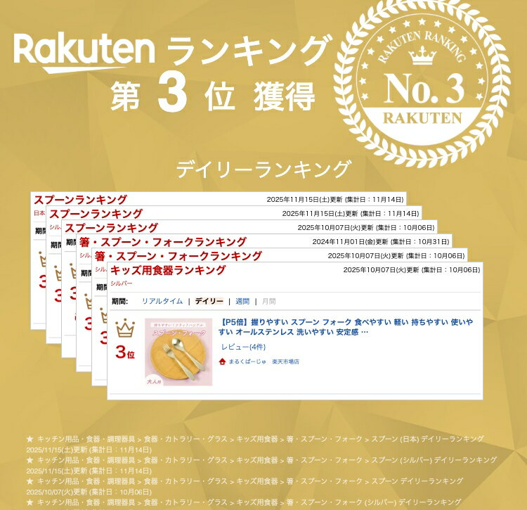 商品説明サイズ 【スプーン】 長さ:17.4cm 口幅:3.5cm 【フォーク】 長さ:17.5cm 口幅:2.2cm 材質ステンレス商品説明 ハンドル部分を幅広く、 平らに設計しているので、 親指、人差し指、中指の三本の指で 三点持ちしたときの安定感は抜群です! 食器洗浄機に対応しているので丸洗いしてもOK! ※モニターの発色具合によって実際のものと色が異なる場合がございます。取り扱いについて より長く安心してお使いいただくために。ーーーご使用上の注意ーーー ▼ナイフの刃やフォークの尖った部分などでケガをしないように十分ご注意ください。 ▼電子レンジにはご使用いただけません。直火での食品調理にもご使用にならないでください。 ▼ステンレス製は耐蝕性に優れた金属ですが、汚れや塩分がついたまま放置・保管しますとサビることがありますので、ご注意ください。 ▼サビやすい製品と長い間接触した状態で放置・保管しないでください。サビがステンレスに付着したり、サビる原因にもなることがあります。 ーーーお手入れの方法ーーー ▼たわし、みがき粉でみがくと傷がつきますので、洗浄の際はやわらかいスポンジをご使用ください。 ▼食器洗浄機、乾燥機をご使用の場合は、各機器の注意表記を十分にお読みのうえ、正しい方法でお使いください。 ▼水滴が乾かないうちにケバのない布でよく拭いてください。水滴がついたまま乾かしますと、水滴の跡が取れにくくなります。洗浄後はよく乾かして、湿気の少ないところに保管してください。 ▼エジソンシリーズはこちら ▼リッセシリーズはこちら ▼便利なお箸はこちら ▼スプーンの選び方のポイントはこちら ▼割れにくい強化磁器の食器はこちら ▼他のシリーズはこちらからご覧いただけます 関連商品【P10倍】シリコンゴム フィーディングスプーン 国産 安心 日本製 ...【P10倍】握りやすい スプーン フォーク 食べやすい 軽い 持ちやす...880円770円【P10倍】握りやすい スプーン フォーク 食べやすい 軽い 持ちやす...【P10倍】EDISON スプーン フォーク 握りやすい ベビースプ...660円1,210円【P10倍】EDISON スプーン フォーク 握りやすい 食べやす...【P10倍】EDISON スプーン 握りやすい ベビースプーン 食...770円1,210円【商品説明】 ハンドル部分を幅広く、 平らに設計しているので、 親指、人差し指、中指の三本の指で 三点持ちしたときの安定感は抜群です! 食器洗浄機に対応しているので丸洗いしてもOK! 材質はオールステンレスのため、衛生的で長く使っていただける商品です。 ※モニターの発色具合によって実際のものと色が異なる場合がございます。 【材質】 18-8ステンレス 【生産地】 日本 【スプーン】 長さ:17.4cm 口幅:3.5cm 【フォーク】 長さ:17.5cm 口幅:2.2cm 【取り扱いについてご使用上の注意】 より長く安心してお使いいただくために。 ▼ナイフの刃やフォークの尖った部分などでケガをしないように十分ご注意ください。 ▼電子レンジにはご使用いただけません。直火での食品調理にもご使用にならないでください。 ▼ステンレス製は耐蝕性に優れた金属ですが、汚れや塩分がついたまま放置・保管しますとサビることがありますので、ご注意ください。 ▼サビやすい製品と長い間接触した状態で放置・保管しないでください。サビがステンレスに付着したり、サビる原因にもなることがあります。 ※モニターの発色具合によって実際のものと色が異なる場合がございます。 【お手入れの方法】 ▼たわし、みがき粉でみがくと傷がつきますので、洗浄の際はやわらかいスポンジをご使用ください。 ▼食器洗浄機、乾燥機をご使用の場合は、各機器の注意表記を十分にお読みのうえ、正しい方法でお使いください。 ▼水滴が乾かないうちにケバのない布でよく拭いてください。水滴がついたまま乾かしますと、水滴の跡が取れにくくなります。洗浄後はよく乾かして、湿気の少ないところに保管してください。 まるくぱーじゅの強化磁器の特徴 【環境に優しいリサイクル食器】 まるくぱーじゅの食器は、エコマークの認定を受けた地球環境に優しい製品です。 全国の保育・学校給食用食器を中心に破損食器を回収し、原材料に18%配合することで高い強度を維持したリサイクル商品を製造しています。 子どもたちが使った食器をリサイクルすることで、環境教育としても役立っています。 ※一部の食器は、製造の工程上リサイクル食器ではございません。 【安全性】 厚生労働省の食品衛生法に適合し、鉛・カドミウム・環境ホルモンなど子どもの成長に影響を与える成分が溶出することはありません。 子どもの安全を考えた安全性重視の食器です。 【割れにくさを求めるならコレ!】 まるくぱーじゅの強化磁器は、業界トップクラスの素材強度の土を使用して製造しております。 約1万食の給食センターでも使用できる割れにくさとなっています。 割れにくさの数値は、普通の陶磁器の約3倍程度になります。 この数値は他の強化磁器と比較してもトッ