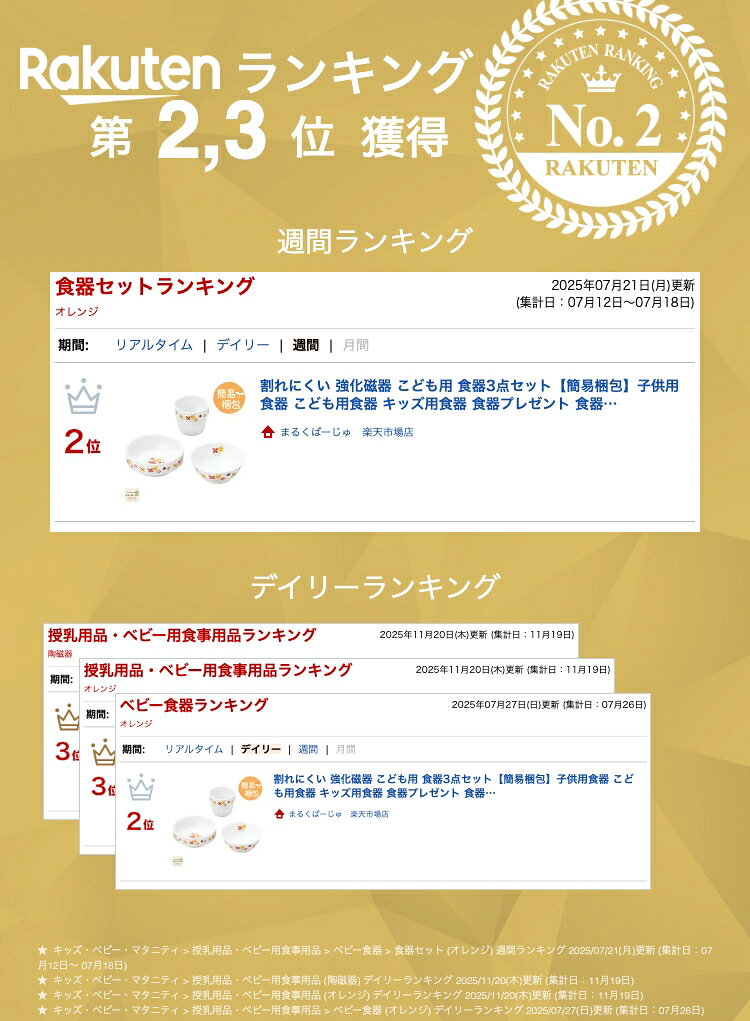 商品説明サイズ<ボール> 口径:約11cm、高さ:約4.7cm、容量:約210ml<US小鉢>口径:約11.5cm、高さ:約4.2cm、容量:約290ml<コップ> 口径:約7.4cm、高さ:約6.6cm、容量:約170ml※陶磁器の特性上、寸法に若干の誤差が生じることがございます。 材質強化磁器 色・絵柄 ブルーメ/オレンジ商品説明 全国の保育園などの給食用食器として使われている「おぎその強化磁器」を、 使いしやすいカタチを集めて、毎日使える食器3点セットを作りました。お茶碗でも、小鉢でも、普段使いしやすい「ボール」。 保育現場で人気のこどもの食べたい!を応援する”返し”のついた「すくいやすい小鉢」。 ”くぼみ”のある特徴的なカタチで、こどもの小さな手にフィットする「コップ」。 こどもだけでなく、大人も普段使いできるアイテムで、普段使いや大切な人への贈りものとしてもオススメです! ※モニターの発色具合によって実際のものと色が異なる場合がございます。取り扱いについてより長く安心してお使いいただくために。ーーーご使用上の注意ーーー ▼強化磁器は一般の磁器と比べて割れにくい材質ですが、土から作る焼き物なので、衝撃が加わると割れてケガをする恐れがあります。 ▼およそ1250℃の高温の窯で焼いて作られるので、熱に非常に強いですが、直火ではお使い頂けません。 ▼電子レンジ・オーブン(直火不可)・食器洗浄乾燥機は使用できます。各機器の注意表記を十分にお読みのうえ、正しい方法でお使いください。 ▼長期間金属製のスプーンフォークなどで食器を強く擦ると、表面にキズがつきメタルマークが取れなくなることがあります。ーーーお手入れの方法ーーー ▼やわらかいスポンジをお使いください。金属たわしや研磨剤付きスポンジ、クレンザーなどは食器表面にキズをつける原因となります。 ▼少量の洗剤でキレイに洗浄できますが、目に見えない油分が残っている場合があるので、定期的に漂白剤のご使用をおすすめします。 ▼簡易梱包の他の食器セットはこちら ▼単品をお探しの方はこちら まるくぱーじゅの強化磁器の特徴 【環境に優しいリサイクル食器】 まるくぱーじゅの食器は、エコマークの認定を受けた地球環境に優しい製品です。 全国の保育・学校給食用食器を中心に破損食器を回収し、原材料に18%配合することで高い強度を維持したリサイクル商品を製造しています。 子どもたちが使った食器をリサイクルすることで、環境教育としても役立っています。 ※一部の食器は、製造の工程上リサイクル食器ではございません。 【安全性】 厚生労働省の食品衛生法に適合し、鉛・カドミウム・環境ホルモンなど子どもの成長に影響を与える成分が溶出することはありません。 子どもの安全を考えた安全性重視の食器です。 【割れにくさを求めるならコレ!】 まるくぱーじゅの強化磁器は、業界トップクラスの素材強度の土を使用して製造しております。 約1万食の給食センターでも使用できる割れにくさとなっています。 割れにくさの数値は、普通の陶磁器の約3倍程度になります。 この数値は他の強化磁器と比較してもトップクラスの強度を誇ります。 ※過度の衝撃で破損の可能性がございます。割れないわけではございませんのでご注意ください。 ▼他のシリーズはこちら 関連商品【P10倍】ピーターラビット 割れにくい こども用 食器3点セット ...【P10倍】割れにくい 強化磁器 こども用 食器&スプーンフォークセッ...6,162円10,324円【P10倍】強化磁器 こども用 食器3点セット【簡易梱包】【ブルーメ・...【P10倍】割れにくい 強化磁器 こども用 食器3点セット【簡易梱包】...5,598円5,598円【商品説明】 全国の保育園などの給食用食器として使われている「おぎその強化磁器」の中から、使いしやすいカタチを集めて、毎日使える食器3点セットを作りました。 お茶碗でも、小鉢でも、普段使いしやすい「ボール」。 保育現場で人気のこどもの食べたい!を応援する返しのついた「すくいやすい小鉢」。 くぼみのある特徴的なカタチで、こどもの小さな手にフィットする「コップ」。 こどもだけでなく、大人も普段使いできるアイテムで、普段使いや大切な人への贈りものとしてもオススメです! ※モニターの発色具合によって実際のものと色が異なる場合がございます。 【セット内容】 食器3点セット 簡易梱包 こちらはプレゼント用のギフトBOXに入っておりません。ご注意ください。 【サイズ】 <茶碗> 口径:約11cm、高さ:約4.7cm、容量:約210ml <US小鉢> 口径:約11.5cm、高さ:約4.2cm、容量:約290ml <コップ> 口径:約7.4cm、高さ:約6.6cm、容量:約170ml ※陶磁器の特性上、寸法に若干の誤差が生じることがございます。 【材質】 強化磁器 【生産地】 岐阜県 【色・絵柄】 ブルーメ・オレンジ ▲このページの上部へ 〈まるくぱーじゅTOPページへ〉 ■商品レビューはこちら ※誤って商品ページを一度削除してしまいました。 こちらから過去のレビューをご覧いただき、ご参考にしていただけますと幸いです。