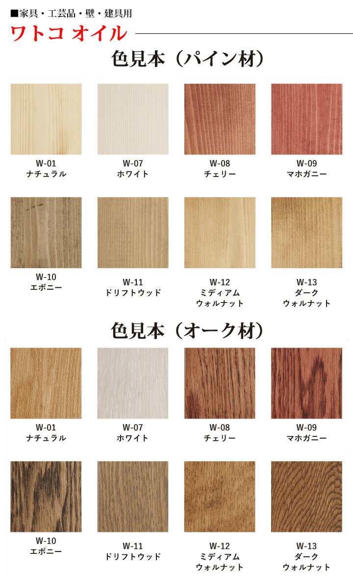 ■ワトコオイルは60年もの間、もともとスカンジナビア半島やデンマーク市場に向けて生産されているものです。 デンマークにおいては、市場のリーダーであり床や家具に普通に使われております。そのため、一般的には「ダニッシュオイル」として知られています。 ■ワトコオイルは樹が持つ美しさ、その木味をより美しく表現します。ワトコオイルは、亜麻仁油を主成分とした植物油をベースとするオイルフィニッシュです。樹の中に浸透することにより、樹の呼吸を止めず、湿度を保ち、樹の深い味わいとぬくもりを醸し出します。 ■8色のオイルと2色のワックスがあります。 オイルは18リッターで約180平米塗る事ができます。 ■道具の洗浄はペイント薄め液で洗って下さい。 ■オイルの染み込んだ布(ウエス)は自然発火の危険がありますので、水に浸してから処分してください。詳しくはこちらをご覧下さい。