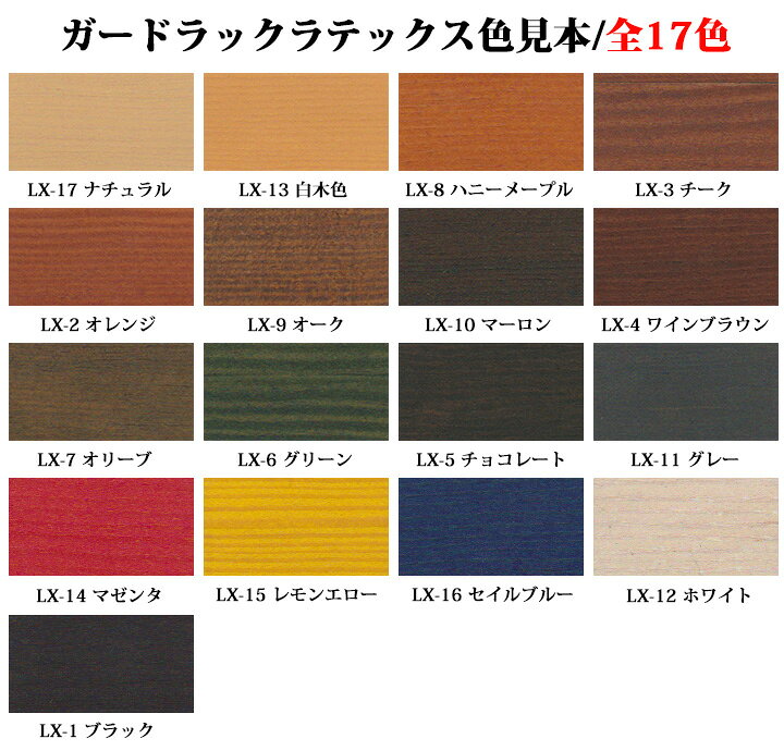 木目を活かした鮮明な仕上がり 待望の水系浸透タイプの木材保護塗料。水系でありながら溶剤系のような、木目を活かした鮮明な仕上がり感です。 屋内・屋外木部用 防虫・防腐・防カビ効力をカプセル化/木目をいかした浸透タイプ。抜群の持続力と耐候性/2回塗りでOK ■ 用途 屋内外木部全般の保護着色 壁面・腰板・巾木・天井・窓枠・柱・梁・羽目板・破風・下見板・軒天井・板塀・門扉・公園遊具・木橋・デッキ・ログハウス・ベンチ・パーゴラ etc... ■ 特長 ●木目をいかした浸透タイプの鮮明な色あい 新規塗装に最適 ●作業性が良好で塗ムラの少ない美しい仕上がり ●今後の仕様に求められてくるさらなる環境性能 低VOC ●防虫・防腐・防カビの薬効成分をマイクロカプセルで包み込み、徐々に放出 させることで、持続性も安全性もアップ。 ●日本建築学会材料規格 JASS18 M-307 適合 ■ 標準塗装工程 1.P150サンドペーパーにて研磨 2.ガードラック ラテックスをハケで塗り、(塗布量目安50g/m2)2時間/20℃以上乾燥。 3.ガードラック ラテックスをハケで塗り、(塗布量目安50g/m2)一夜養生。 ※必ず試し塗りをして下さい。 ※着色1回目と2回目は同じ色をお使い下さい。 ※塗布量は素材の吸い込み具合により大きく変わります。 また、乾燥時間は塗装状況により変わりますので目安として下さい。
