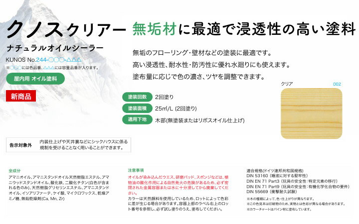 通気性があり、特に高い防水機能を持つ浸透性自然オイル。 浸透型オイルでありながら表面層にごく薄い膜をはり、強靭な耐久性、撥水性、耐汚染性を発揮します。薄い膜をはるからといって、木の呼吸を止めたりする事はありません。 針葉樹・堅木両用で肉持ちの良いしっとりとした3分程度の艶を与えます。 汗・唾液に対して安全性についてもドイツ規格(DINEN71part3)に合格していますので、幼児用製品、テーブルや食品に触れるものにも安心してお使いいただけます。幼児玩具の安全規格(DIN EN 71 Part3)合格品。 ●特徴 無垢の家具・窓枠・床など屋内木部。撥水効果が高く水廻りに最適です。 OSBボードにも適します。ベニヤや突板には使用できないこともあります。 複合ボードやキャビネット内部には適しません。