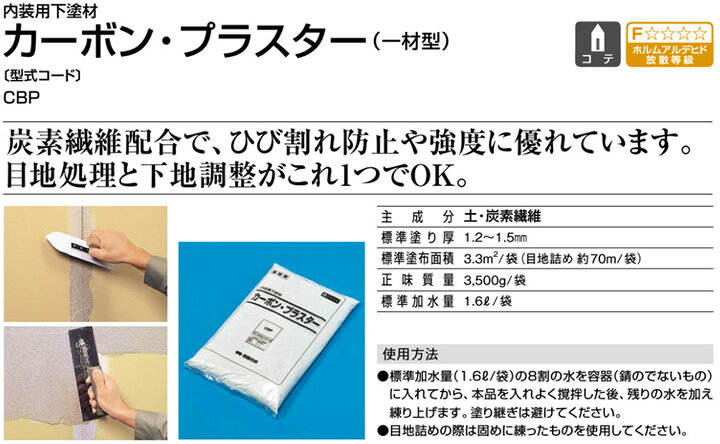 炭素繊維配合で、ひび割れ防止や強度に優れています。目地処理と下地調整がこれ1つでOK。 ●使用方法 ・標準加水量(1.6ℓ/袋)の8割の水を容器(錆のでないもの)に入れてから、本品を入れよく攪拌した後、残りの水を加え練り上げます。塗り継ぎは避けて下さい。 ・目地詰めの際は固めに練ったものを使用して下さい。 ●カーボンプラスター商品説明 主成分 土・炭素繊維 標準塗り厚 1.2〜1.5mm 標準塗布面積 3.3平米/袋(目地詰め 約70m/袋) 正味質量 3,500g/袋 標準加水量 1.6ℓ/袋