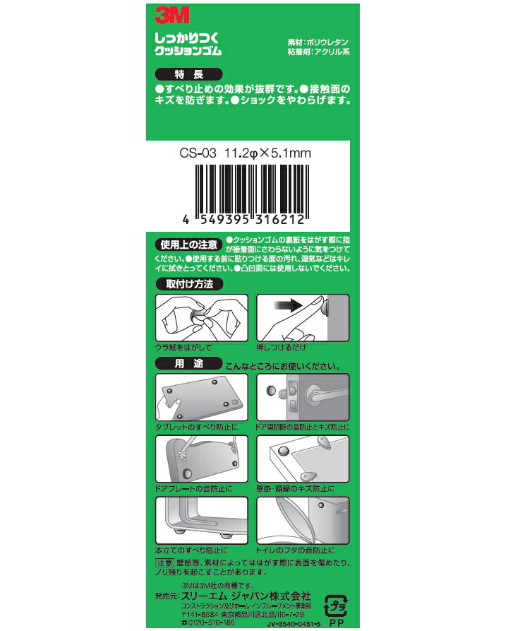 弾力性に優れたクッションゴム 《素材》ポリウレタン 《粘着剤》アクリル系 《粒数》16粒 《形状》丸形 《サイズ》11.2mm×5.1mm 《用途》 ●タブレットの滑り止めに ●ドア開閉時の音防止とキズ防止に ●ドアプレートの音防止に ●壁掛・額縁のキズ防止に ●本立てのすべり防止に ●トイレのフタの音防止に 《特長》 ●高い接着力ではがれやズレに強いです。 ●耐久性が高くゴムの変色や劣化が少ないです。 ●すべり止め効果が抜群です。 ●接触面のキズを防ぎます。 ●ショックをやわらげます。 《注意》 ●壁紙・素材によっては、はがす際に表面を痛めたり、ノリ残りを起こす事があります。 ●凹凸面には使用しないで下さい。