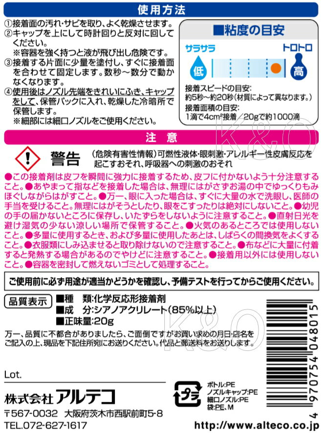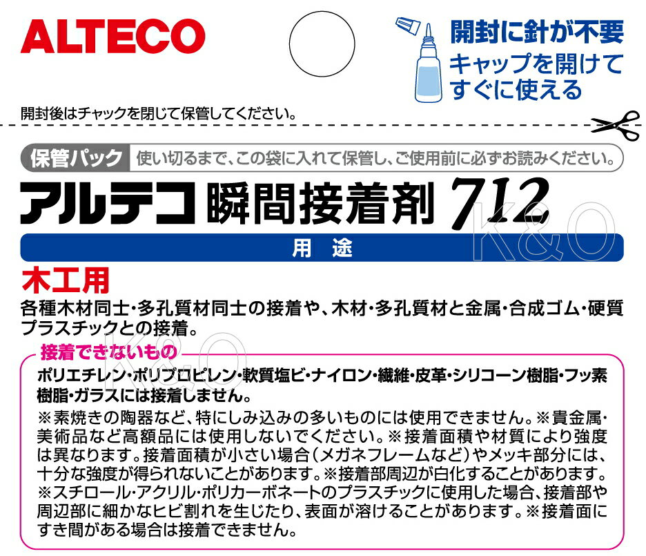 《成分》シアノアクリレート(85%以上) 《用途》 ●木工用の瞬間接着剤です。 ●各種木材同士・多孔質材同士の接着や、木材・多孔質材と金属・合成ゴム・硬質プラスチックとの接着に。 《特長》 ●高粘度です。 ●接着スピードの目安:5〜20秒(材質により異なります) ●1摘で4平方センチメートル接着 ●20gで約1000摘 ●細口ノズル付き 《接着できないもの》 ●ポリプロピレン・ポリエチレン・軟質塩化ビニル・ナイロン・繊維・皮革・シリコーン樹脂・フッ素樹脂・ガラスには接着しません。 ●素焼きの陶器など、特にしみ込みの多いものには使用できません。 ●貴金属・美術品など高額品には使用しないでください。 ●接着面積や材質により強度は異なります。接着面積が小さい’(メガネフレームなど)場合やメッキ部分には、十分な強度が得られないことがあります。 ●接着部周辺が白化することがあります。 ●スチロール・アクリル・ポリカーボネートのプラスチックに使用した場合、接着部や周辺部に細かなヒビ割れを生じさせたり、表面が溶けることがあります。 ●接着面にすき間がある場合は接着できません。