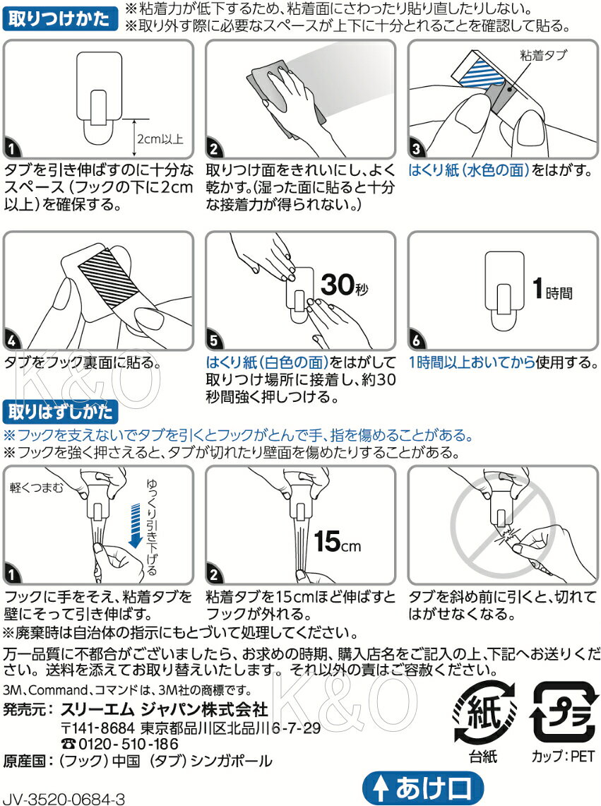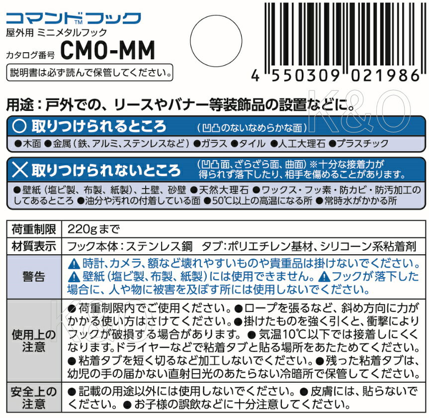 屋外に使えるUVタブを使ったコマンドフック 《材質》 フック本体:ステンレス鋼 タブ:ポリエチレン基材、シリコーン系粘着剤 《用途》 戸外での、リースやバナー等装飾品の設置などに。 《特長》 ●耐UV粘着タブ 《取り付けられるところ》 ●凹凸面のないなめらかな面、木面、金属(鉄、アルミ、ステンレスなど)、ガラス、タイル、人工大理石、プラスチック 《取り付けられないところ》 ●壁紙(塩ビ製、布製、紙製)、土壁、砂壁、天然大理石、ワックスやフッ素や防カビや防汚加工してあるところ、油分や汚れの付着している面、50℃以上高温になるところ、常時水のかかる所 ●凹凸面、ざらざら面、曲面※十分な接着力が得られず落下したり、相手を傷めることがあります 《荷重制限》 220gまで 《警告》 ●時計、カメラ、額、など壊れやすいものや貴重品は掛けないでください。 ●壁紙(塩ビ製、布製、紙製)には使用できません。 ●フックが落下した場合に、人や物に被害の及ぼす所には使用しないでください。