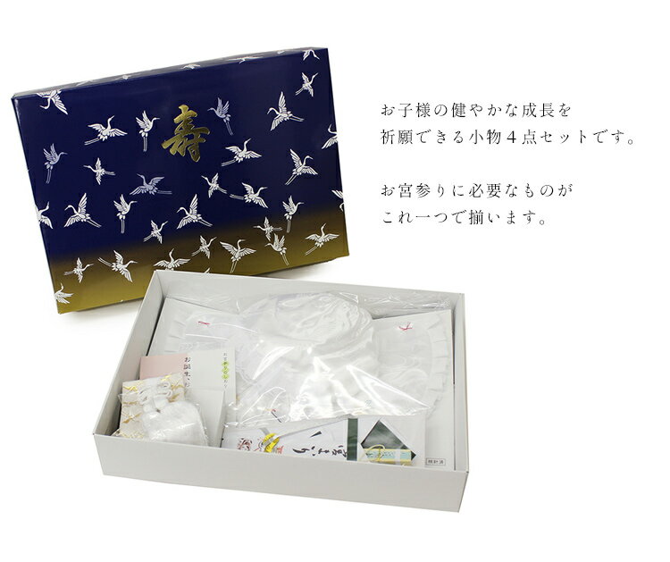 寸法(cm) よだれ掛け:長さ約12cm、半径約13.5cm帽子:最大44cm(紐で調整可能) 素材 ポリエステル100%無ホルマリン(乳児の安全を守るための無ホルマリンなので、安心して御利用頂けます。 生産国 日本 季節 通年 用途 お宮参り 一般的に男児は生後31日、女児は33日。(地域によって異なります。) ポイント お宮参りに使う、よだれ掛け、帽子、お守り、末広扇子の4点セットです。お子様の健やかな成長を祈願できるお得なセットに、豪華!化粧箱、さらにしおりも付いています! ●セット内容・よだれ掛け(鶴と松竹の刺繍、フリルのついたかわいいデザインです)  ・帽子(紐でサイズが調整できます)  ・お守り(おめでたい鶴の刺繍入りです)  ・末広扇子(麻の紐は、健康で髪が白くなるまで長生きできますようにという意味が込められています) 画像について 可能な限り実物に近い色、風合いを表現できるように調整しておりますが、モニターの設定等によって多少誤差が生じる事がございます。あらかじめご了承下さい。 注意点 ・本商品は、セット商品での販売となります。 ・仕様及び商品番号などは機能向上の為、予告なしに変更することがあります。 キッズ和装(子供用)カテゴリ類似商品はこちらお宮参り 4点セット お宮参りフード4点セット4,190円お宮参り 7点セット お宮参りフード7点セット11,400円還暦 正絹還暦セット 高級 正絹地紋入りの還暦32,160円米寿祝い フルセット 黄色いちゃんちゃんこ +2,980円ラッピング可 綸子還暦お祝いセット ちゃんちゃ8,250円古希 紫 ちゃんちゃんこ 古稀 セット 古希2,980円還暦祝い 赤い ちゃんちゃんこ 5点セット 2,980円着物セット 子供 着物 12点セット RK リ72,100円正絹白寿セット!やっぱり王道 正絹の白寿祝いフ28,200円新着商品はこちら2025/11/20メンズ 合わせ止 着付小物 すっきりとした衿元880円2025/11/20半幅帯 長尺 日本製 4m リバーシブル レデ2,480円2025/11/20半幅帯 長尺 日本製 4m リバーシブル レデ2,480円再販商品はこちら2025/11/27ラミエール ぼかし帯揚げ 洗える ちりめん お3,480円2025/11/25下駄 男 メンズ 焼下駄 黒 桐 ブラック F1,100円2025/11/20あづま姿 クリップ 着物クリップ 衿止め ハン2,140円類似商品はこちらお宮参り 4点セット お宮参りフード4点セット4,190円お宮参り 7点セット お宮参りフード7点セット11,400円還暦 正絹還暦セット 高級 正絹地紋入りの還暦32,160円