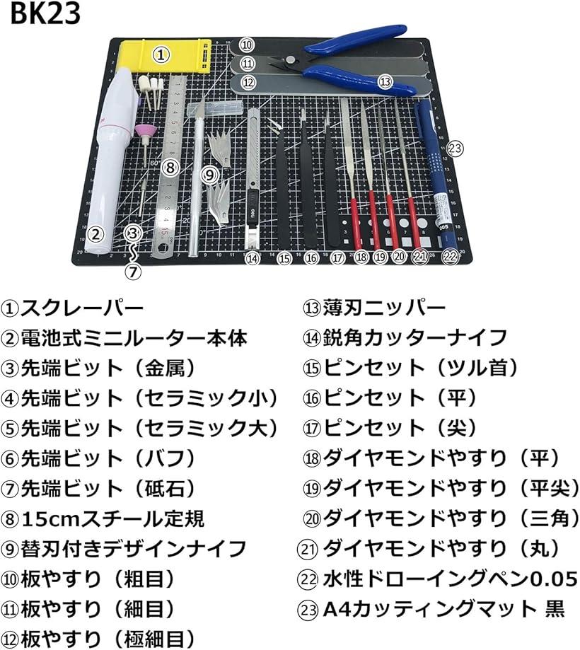 バリエーションコード : 2b4fgs9rps商品コード2b60snr8i2商品名プラモデル工具セット ガンプラ工具 模型工具 プラモ工具 クラフトツール 23種類 BKブランドAW-NetカラーBK・AW-Net プラモデル工具セット ガンプラ工具 模型工具 プラモ工具 クラフトツール 23種類セットは、プラモデル製作、ペーパークラフト、その他各種工作を始めるあたって便利なツールが一度に揃うセット商品です・このセットの工具は値段相応の性能です。大手模型会社ブランドのニッパー1本分でこれだけの種類が揃うことに価値を見出せる方へおすすめします。「とりあえず工具類を使って作業してみたい」「もっとよいものが欲しくなれば買い足したい」といった入門者のニーズに答えるために企画しました。あなたの趣味の第一歩にぜひどうぞ・ステンレス製精密ピンセットは細かな部品を掴みやすく設計。替刃付きデザインナイフは細かな切り出しや曲線カット自由自在。コードレス電池式のミニハンディールーターはバリ取り作業の効率化や磨き作業の効率化をサポートします・板ヤスリの番手は粗目600番,細目1000番,極細目2000番。カッターやデザインナイフは刃先が鋭角で各種切り出しにおいて取り回しに優れます。モデラ―推奨のパイロット製水性ドローイングペンはペン先極細0.05mm仕様で初心者でも失敗せずにスミ入れ加工が楽しめます・「セット内容」カッティングマット(A4)、プラモデル用精密ピンセット3種、ステンレス定規(15cm)、プラモデル用ニッパー、プラモデル用カッターナイフ、スクレーパー、水性ドローイングペン極細0.05mm、プラモデル用ダイヤモンドヤスリ4種、プラモデル用板ヤスリ3種、替刃付きデザインナイフ(替刃10枚)、電池式ミニルーター本体(単3電池別売)、ルーター先端ビット5種※ 他ネットショップでも併売しているため、ご注文後に在庫切れとなる場合があります。予めご了承ください。※ 品薄または希少等の理由により、参考価格よりも高い価格で販売されている場合があります。ご注文の際には必ず販売価格をご確認ください。※ 沖縄県、離島または一部地域の場合、別途送料の負担をお願いする場合があります。予めご了承ください。※ お使いのモニタにより写真の色が実際の商品の色と異なる場合や、イメージに差異が生じることがあります。予めご了承ください。※ 商品の詳細(カラー・数量・サイズ 等)については、ページ内の商品説明をご確認のうえ、ご注文ください。※ モバイル版・スマホ版ページでは、お使いの端末によっては一部の情報が表示されないことがあります。すべての記載情報をご確認するには、PC版ページをご覧ください。色:BK「AW-Netプラモデル工具セットガンプラ工具模型工具プラモ工具クラフトツール23種類セットは、プラモデル製作、ペーパークラフト、その他各種工作を始めるあたって便利なツールが一度に揃うセット商品です。このセットの工具は値段相応の性能です。大手模型会社ブランドのニッパー1本分でこれだけの種類が揃うことに価値を見出せる方へおすすめします。「とりあえず工具類を使って作業してみたい」「もっとよいものが欲しくなれば買い足したい」といった入門者のニーズに答えるために企画しました。あなたの趣味の第一歩にぜひどうぞ。ステンレス製精密ピンセットは細かな部品を掴みやすく設計。替刃付きデザインナイフは細かな切り出しや曲線カット自由自在。コードレス電池式のミニハンディールーターはバリ取り作業の効率化や磨き作業の効率化をサポートします。板ヤスリの番手は粗目600番,細目1000番,極細目2000番。カッターやデザインナイフは刃先が鋭角で各種切り出しにおいて取り回しに優れます。モデラ―推奨のパイロット製水性ドローイングペンはペン先極細0.05mm仕様で初心者でも失敗せずにスミ入れ加工が楽しめます。「セット内容」カッティングマット(A4)、プラモデル用精密ピンセット3種、ステンレス定規(15cm)、プラモデル用ニッパー、プラモデル用カッターナイフ、スクレーパー、水性ドローイングペン極細0.05mm、プラモデル用ダイヤモンドヤスリ4種、プラモデル用板ヤスリ3種、替刃付きデザインナイフ(替刃10枚)、電池式ミニルーター本体(単3電池別売)、ルーター先端ビット5種安全警告ツールを使用する際は手指を切らないように注意してください。