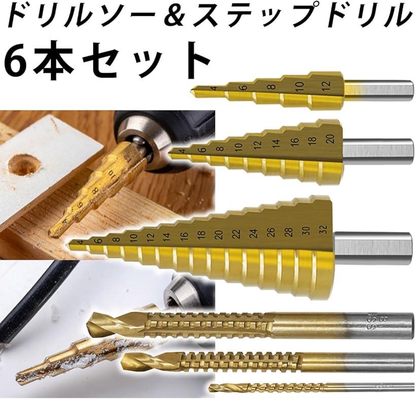 【楽天ランキング1位入賞】互換品ステップドリル ドリルソー 穴あけ たけのこ ビット スパイラル ツイスト HSS 電動工具 ツール 金属 鉄工 木工 6本セット 単品 (Gold, 6本セット(単品))