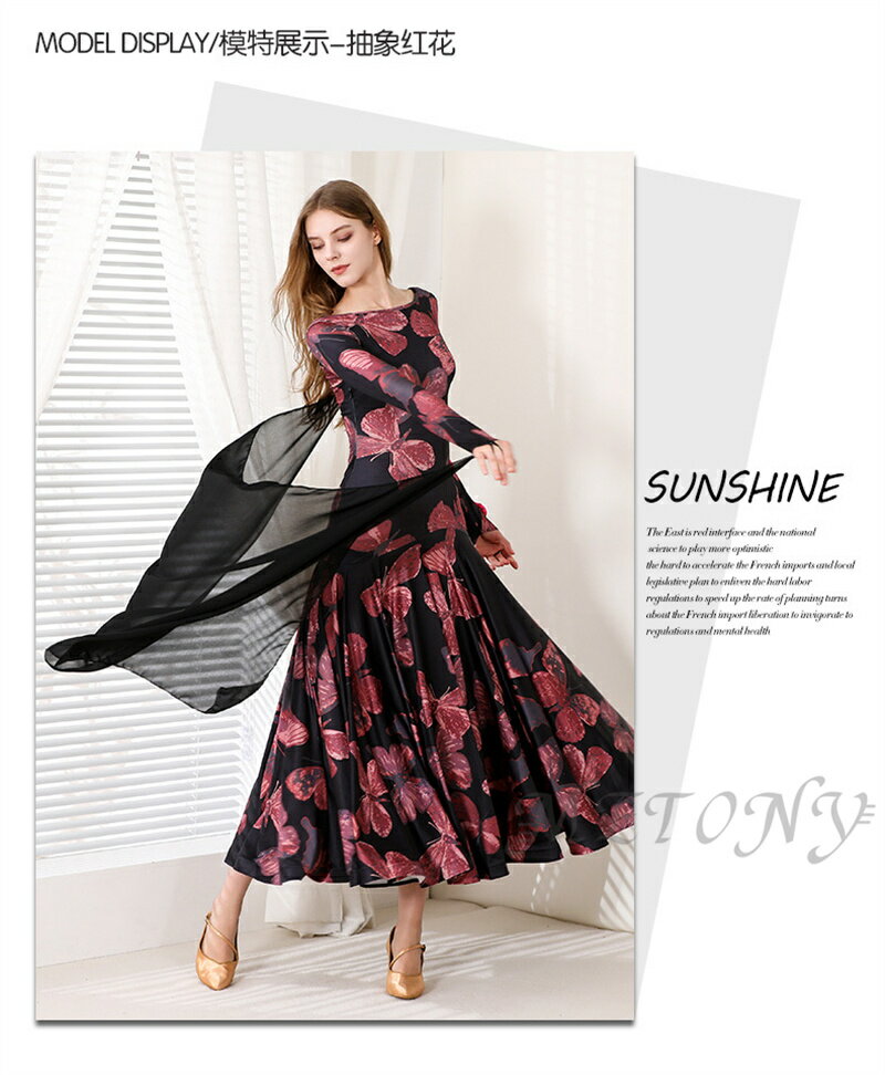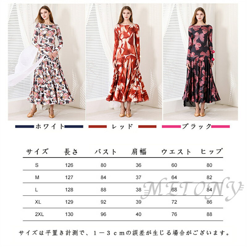 社交ダンス ダンス服 ダンスドレス ワルツ 総柄 花柄 おしゃれ 豪華 大きい裾 ひらひら付き ホワイト レッド ブラック 長袖 舞踏会 ステージ 忘年会 イベント パーティ 発表会 祭り S M L XL 2XL