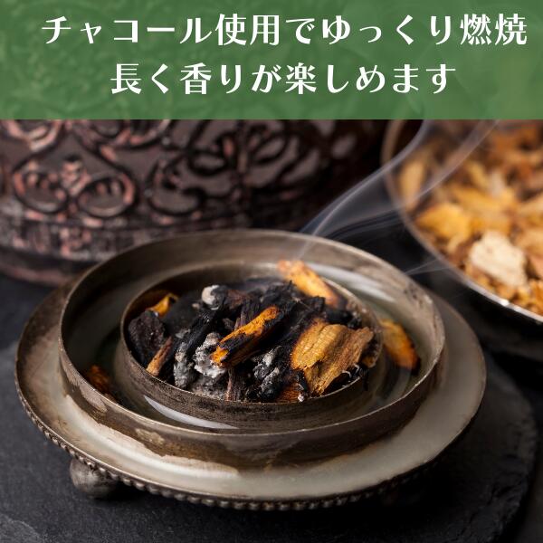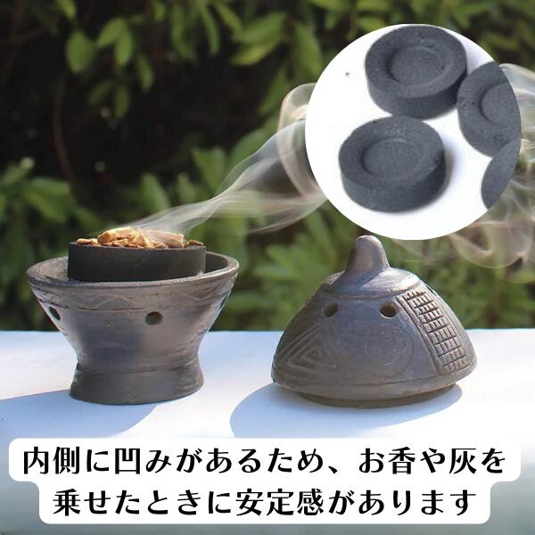 このチャコールタブレットは、約33mmのサイズで、約60分間燃焼します(環境により誤差があります)。ホワイトセージやパロサントパウダーなどの薫香を燃焼するのに最適で、ニオイが少ないのでお香本来の香りを邪魔しません。タブレット内側には粉末やチップ状のお香が収まりやすい設計になっており、底面には丸い膨らみがあり、安定した形状で香炉や灰の中で燃焼します。また、水タバコ(シーシャ)にも利用可能です。 ライターで着火し、火傷しないように手に持たずに置いた状態で着火するか、チャコール専用トングを使用してください。着火するとパチパチと火花が散り、タブレットは耐熱皿や香炉に置き、下に熱が伝わらないようにしてください。1タブレットで約1時間ほど燃焼しますが、必要に応じて手で割って小さくすることもできます。 ポスト投函可能なサイズにするために、ジップロックに移し替えて発送され、デザインは微妙に変更される場合がありますのでご了承ください。チャコールタブレット専用トングはこちら [サイズ]約33mm約60分にわたって燃焼します。*燃焼時間は環境により誤差があります。 *ポスト投函は50個までです。100個以上購入の際には、ケース購入となり、宅配便またはレターパックでお届けします。 ホワイトセージ・パロサントパウダー、粉末香、樹脂香などの薫香の燃焼に便利なチャコールタブレット10個セットです。ニオイが少ないので、お香本来の香りを邪魔しません。 タブレット内側に窪みがあるために、粉末、チップ状のお香が収まりやすくなっています。また、底面に丸い膨らみがあり、香炉の砂や灰の中で安定しやすい形状です。 当製品は、お香製品だけでなく、水タバコ(シーシャ)にも利用いただけます。 [ご利用方法] タブレットにライターで着火することができます。火傷しないよう、手に持たずに置いた状態で着火するか、別売のチャコール専用トングをご利用ください。パチパチと火花が散って着火します。タブレットは、耐熱皿や香炉などに置き、下に熱が伝わらないようにしてください。1タブレットで約1時間ほど燃焼します。少量のみ燃焼されたい場合は、着火前にタブレットを手で割って小さくすることができます。 [ご注意ください] ポスト投函可能なサイズにするために、ジップロックに移し替えて発送させていただきます。また、チャコールの表面に刻印がされたりと、デザインが微妙に変更になる場合がございます。ご了承ください。