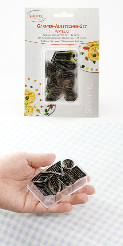 ドイツ、STADTER(スタッダー)製の抜き型セットです。 デコレーションなどに組み合わせて楽しいミニサイズの抜き型です。またちょっと仕舞いづらいですがケースも付いていますので、バラバラにならずに保管できます。 写真の様にピンセットで持つくらい小さいので、柔らかめの生地には向いていません。 生地などを抜く際は、固めの生地に使い、抜いた後は棒やピンセット等で押し出して使ってください。 ☆----- スタッフより-----☆ 小さいケースにびっちり入っているため、取り出すのが大変です・・・。また一度に全部出さないのであれば、ピンセットがあると便利です。 材質 ステンレス サイズ 丸φ7、φ9、φ12、φ14、φ17、φ19×H18mm四角1辺10、14、18、20、23mm三角1辺10、14、18、22、26、30mmひし形1辺8、10、13、16、20、22mmしずく7×12、8×16、10×22、12×25、14×28、16×32mm平行四辺形13×5、15×7、20×10、22×11、25×13、30×16mmラグビーボール12×7、17×9、21×11、25×13、30×16、34×17mm全種H18mm 生産国 ドイツ 注意事項 長時間、食品・食用油・洗浄液・食塩水に触れたた場合、錆が発生する可能性があります。この製品は製菓用です。実際の商品が写真と若干異なる場合があります。また記載サイズ等を予告なしに変更する場合があります。 ※この商品は輸入品のため、当店入荷時よりパッケージに擦り傷などがあります。また、型に歪みがある場合が多いですので、完璧な状態をお望みの方はご遠慮ください。ご理解、ご了承下さい。