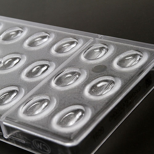 手作りチョコレートの流し型(チョコレートモールド)です。 世界中のプロショコラティエが使用する硬質タイプのチョコレート型です。 型からチョコを取り外す際は、布を敷いた固い机やめん台などに型の端を、コンコンと当てて外して下さい。 サイズ表記の中にあるグラム表示は一つあたりのおおよその目安です。 温度管理(テンパリング)をしっかりすることが、チョコ作りのポイントです!頑張ってくださいネ♪ 材質 ポリカーボネイト サイズ・板厚 外寸 約275×135×H25mm 一つあたり 約18×26×H7mm(約2.6g) 生産国 ベルギー 注意事項 火のそばに置かないでください。傷が付きやすいので、たわし等は使用しないでください。この製品はチョコレート作り専用です(チョコレート作りに適した温度でお使いください)。実際の商品が写真と若干異なる場合があります。また記載サイズ等を予告なしに変更する場合があります。