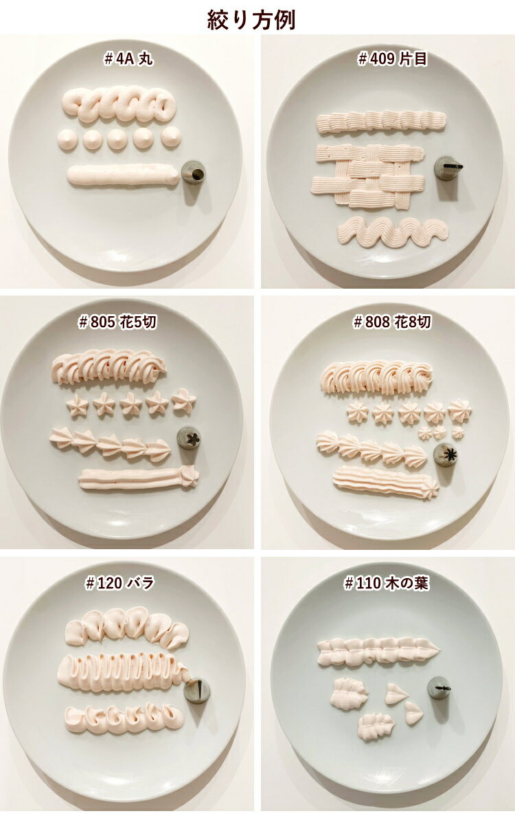 真鍮製の口金の6個セット(#4A.808.805.409.110.120)です。 このセットはケーキ等のデコレーションに使うようなサイズの口金になっています。 業務用の高品質な製品です! 材質 真鍮製・ニッケルメッキ仕上げ サイズ・板厚 絞り口サイズ #4A 丸 約φ9.5mm #808 花8切 約φ11mm #805 花5切 φ11mm #409 片ムカデ/片目 約15×3mm #110 木の葉 約13mm #120 バラ 約15mm 生産国 日本 注意事項 真鍮製品は柔らかいため、強い力を加えると変形しますので注意してください。磨き粉で磨くと表面のメッキが剥がれの原因となります。 また、塩素系漂白剤での洗浄はメッキが剥がれますので、お止めください。 一つ一つ、形に微妙な違いがある場合があります。 この製品は製菓用です。実際の商品が写真と若干異なる場合があります。また記載サイズ等を予告なしに変更する場合があります。