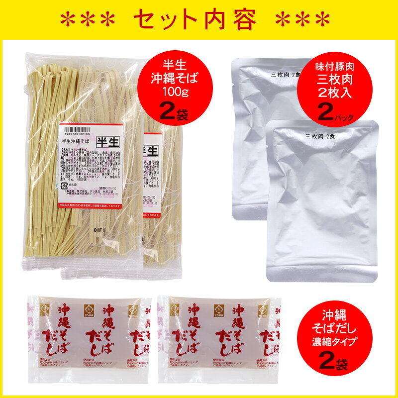 内容量 半生沖縄そば100g×2、そばだし22g×2、三枚肉(2枚入り)×2 原材料 【麺】小麦粉(国内製造)、食塩、食用油脂/酒精、かんすい、焼成Ca、クチナシ色素 【味付け三枚肉】豚バラ肉、醤油、砂糖、食塩、調味料(アミノ酸等)、(原材料の一部に小麦に含む) 【沖縄そばだし】食塩、ポークエキス、砂糖、かつおぶし、調味料(アミノ酸等)(原材料の一部に大豆・乳成分を含む) 賞味期限 製造日より90日 保存方法 直射日光や高温多湿を避け、常温(冷暗所)で保存してください。 (※開封後は賞味期限にかかわらずお早めにお召し上がりください。) 製造者 株式会社 サン食品/沖縄県糸満市 配送方法 メール便でお届け致します。