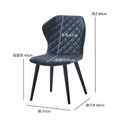 (サイズ) 幅51×奥行60×高さ84(座面高43)cm (材 質) PU・ウレタン・スチール カラー:ブルー/ブラック 組立:脚部取り付け(所要時間約10分) 商品重量:7kg(1脚あたり) 耐荷重:80kg チェア2脚セット販売 (送 料) 送料無料*北海道・東北・沖縄・離島への配送は別途送料かかります。 キルティングデザインが目を引くダイニングチェア 色々なテーブルに合わせやすく、脚部までシート部と同じ張地で覆ったスタイリッシュなモデル。質感あるPU素材をキルティングにすることで陰影を出し、立体感を持たせた魅力的な商品です。 (注意事項)*商品画像は、モニターの設定や照明などの環境により、画像と実物に色の誤差が生じることがございます。 *在庫については、できるだけ迅速に反映させるよう心がけておりますが、在庫有りの商品につきましても、メーカー在庫切れ、廃番の場合がございます。その際は、速やかにメールで連絡いたします。キルティングデザインが目を引くダイニングチェア 色々なテーブルに合わせやすく、脚部までシート部と同じ張地で覆ったスタイリッシュなモデル 質感あるPU素材をキルティングにすることで陰影を出し、立体感を持たせた魅力的な商品です。 同シリーズの背付きベンチも人気モデルです。 カラーは深い色合いのブルーとシックなブラックの2色対応