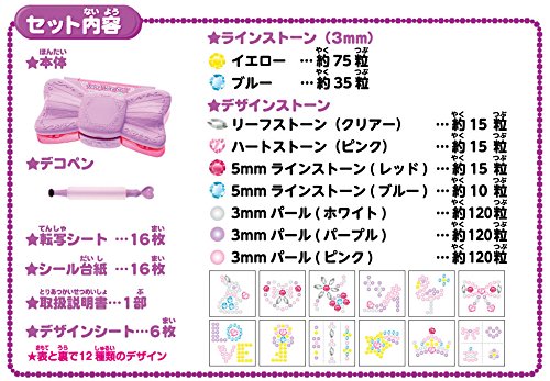 本体サイズ:170×35×90mm対象年齢:6才以上デコペンでストーンをキャッチして置いていくとカンタンにキラキラのデコシールが作れちゃう! 宝石みたいなシール デザインは可愛い12種類! シールはたっぷり16枚分作れるよ! 毎日をもっとキラキラに身の回りのお気に入りのアイテムをキラキラにデコれちゃう! 3mmのラインストーンにキラキラのデザインストーンがプラスされて更にキラキラ☆本体はコンパクで使いやすく、おかたづけも簡単♪ 【内容物】 ●本体:1台●デコペン:1個●ケース:1個●転写シート:16枚●シール台紙:16枚●デザインシート:12種 ●ラインストーン(3mm):・ブルー、イエロー●デザインストーン:リーフストーン(クリアー)、ハートストーン(ピンク)、5mmラインストーン(レッド)、5mmラインストーン(ブルー)、3mmパール(ホワイト)、3mmパール(パープル)、3mmパール(ピンク)