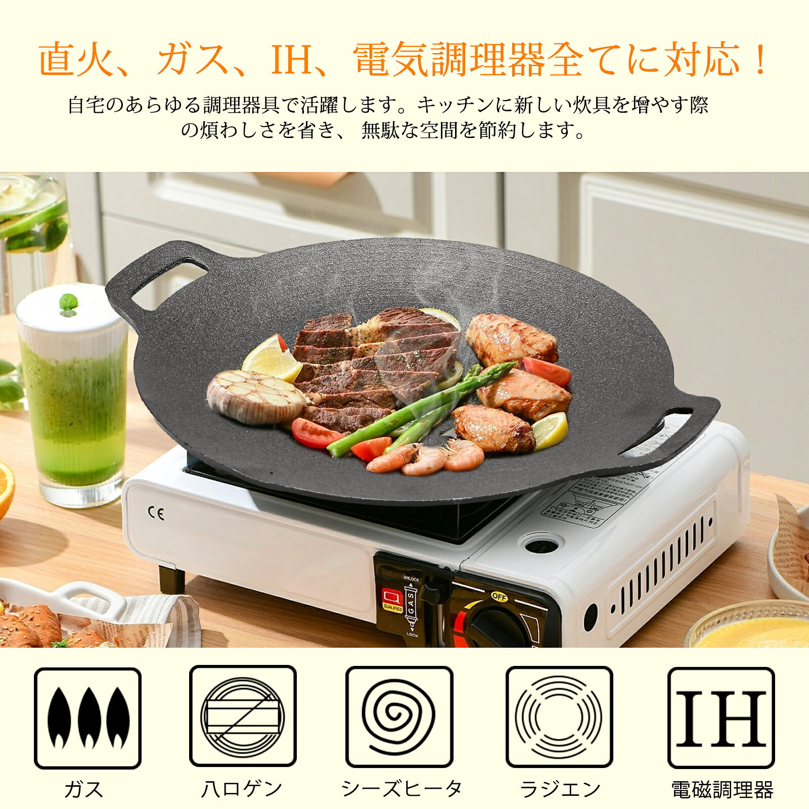 商品詳細 商品説明 熱伝導性に優れた鉄製で、均一な加熱で食材に焼き目を美しく付け、香りと旨みを最大限引き出します。家庭のガス火、IHはもちろん、屋外 BBQ のグリルでも活用可能です。 サイズ 本体サイズ:直径(約)28cm×高さ(約)1.5cm cm 重さ(約):2.02kg 素材 材質:鋳鉄 特徴 🥘【28cm ドーム型 鋳鉄製グリルパン】優れた熱伝導性を備え、全体に均一に熱が伝わる、焦げにくい構造が特長です。食材の食感をしっかりと守りつつ、省エネで手軽に調理を楽しめます。適度なドーム形状を採用しているので、マルチグリドルとの間に広い調理スペースが確保され、使い勝手がよくなります。 🥘【無塗装】無塗装設計により素材の鉄本来の性能を活かし高温での調理でも塗料の溶出を心配する必要がなく安心して使用でき、無塗装の安全性を兼ね備えた長く愛用できる実用的なマルチグリドルです! 🥘【ガス火、IH対応】ガスコンロはもちろん、IH 調理器や電気コンロなど、直火すべて熱源に対応しており、キッチンの設備に関係なく使いやすいです。炒め物から煮込み料理まで、場所を選ばず幅広い調理シーンで活躍します。揚げる、茹でる、蒸す、煮るなど、さまざまな調理方法で活用できます! 🥘【手間とコストを節約でき!】オイルブラシとスコップが付属!セットで使えるので便利で、別途購入する必要がなく、経済的です。 🥘【商品仕様】素材:鉄製;対応デバイス:IH、ガス火、直火すべて対応;重さ:(約)2.02kg;セット内容:マルチグリドル本体×1、オイルブラシ×1、スコップ×1;本体サイズ:直径(約)28cm×高さ(約)1.5cm 原産国中国注意事項※電子レンジは使用不可 ※食器洗い機・乾燥機非対応※商品パッケージは予告なく変更する場合がございます。ご了承ください。 使用上のご説明 ヒント 1.鋳鉄のグリドルは、錆を防ぐために、通常の使用後に洗浄し、水分を拭き取る必要があります。 2.グリドルを持つ際は、厚手のオーブン用手袋をご使用ください。 3.食品を調理する際は、火傷を避けるため、お子様が触れないようご注意ください。 錆びた後の処理方法: 1.表面の錆を除去し、洗浄するために鋼線ボールを使用する 2.グリドルの表面に食品油を塗布する 3.食品油を吸収するために鍋を焼く