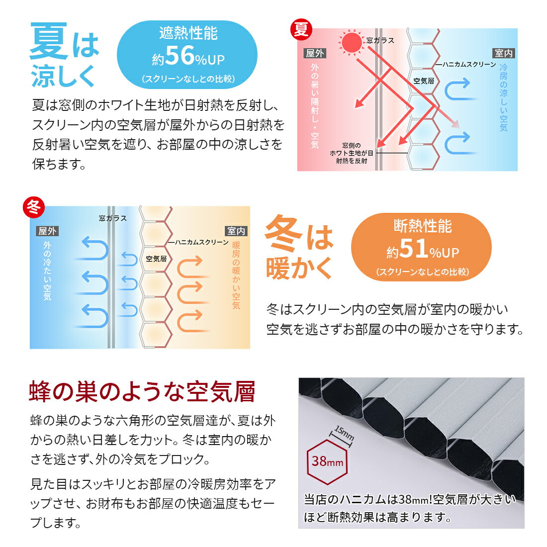 ハニカムシェード ツインタイプ 商品詳細 ハニカムシェード ツインタイプは、採光用と遮光用の生地を1台に搭載した便利なプリーツスクリーンです。 昼間はやさしい自然光を取り入れ、夜はしっかり遮光してプライバシーを守ります。 季節や時間帯に合わせて、快適なお部屋環境を演出できます。 基本情報 商品名:ハニカムシェード ツインタイプ(デイナイト プリーツスクリーン) カラー:全9色(ホワイト/ベージュ/グレー/ライトブラウン/ブラウン/ブラック/スカイグリーン/ガードゥンプール/青藤色) サイズ:オーダー対応可(幅50cm~200cm、高さ50cm~230cm) 操作方法:コードレス式(上下スライドで日夜切替可能) 取付方法:天井付け/正面付け/つっぱり式(穴あけ不要)/カーテンレール付け 商品特徴 日中は採光生地で自然光を取り入れ、夜は遮光生地でしっかり暗室 蜂の巣構造による高い断熱・保温効果 冷暖房効率を高め、省エネ・節電対策に最適 遮光/採光の二層構造で室内の快適さアップ シンプルでおしゃれなデザイン、和室・洋室どちらにも調和 穴あけ不要のつっぱり式なら賃貸でも安心 寝室・リビング・玄関・階段など様々な場所で活躍 サイズご注文時の注意 天井付け:注文幅=窓枠内寸-0.5cm(窓の深さは5.5cm以上必要) 正面付け:窓枠外寸より幅・高さともに5~10cm大きめがおすすめ カーテンレール付け:幅は窓枠外寸、高さはレール下辺から窓枠下辺まで+5~10cm ※ご注文サイズ=製品完成サイズとなります。誤ったサイズでのご注文は返品・交換できませんのでご注意ください。 領収書について 楽天市場の会員様・非会員様ともに、ご購入履歴よりお客様ご自身で領収証をダウンロードいただけます。 当店での領収証発行サービスは行っておりませんのでご了承ください。 お支払い方法に「後払い」をご選択された場合は、収納印のある払込受領書(請求書に付属)が正式な領収書となります。 関連ワード: ハニカムシェード ツインタイプ デイナイト プリーツスクリーン 日夜兼用スクリーン つっぱり式 賃貸OK 採光 遮光 二層構造 断熱 保温 オーダーメイド 窓装飾 和室 洋室 北欧 おしゃれ シンプル 省エネ 二重構造 断熱遮熱保温省エネ節電遮光1級/UVカット/オーダーメイド/賃貸OK/窓装飾/目隠し/和室/洋室/北欧/おしゃれ/シンプル/DIY/新生活 ご不明な点がございましたら、お気軽にお問い合わせください。