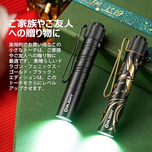 i3T EOSのアップグレード作 ドラゴン&フェニックス ゴールデンブラックという最新着色登場! 高貴さや神秘性を表現する黒と金色に、伝説のドラゴン、フェニックスが加わると、まさに知恵や力、ファンタジーに満ちた無敵の存在となります。 より強力になり、最大ルーメン200ルーメンで、最大21時間の点灯が可能 選択可能なバッテリーオプション、付属の単4電池のほかに、10440リチウムイオン電池を使用することも可能 携帯便利&操作簡単 改善されたポケットクリップ IPX8防水レベル&5年保証 商品詳細 商品仕様 商品名:i3T 2 EOS 最大出力:200lm(単4電池);300lm(10440電池) 最大照射距離:62m(単4電池);80m(10440電池) 最大連続利用時間:21h(単4電池);22.5h(10440電池) バッテリー:単4電池や10440電池体積エネルギ 重量:41.8g(電池を含む) 長さ/高さ:89mm ボディー直径:15mm ヘッド直径:15mm LED:Philips LUXEON TX CW LED (5700-6700K) 商品素材:アルミニウム合金 防水規格:IPX8 耐衝撃:1.5m 製品保証:5年 各モードのスペック詳細(単4電池) ヒント:「~」は【光量が自動的に下がる】ということを示しています。 例えば、400~180lm/10h30+10minの表記の場合 ライトは400ルーメンで10.5時間点灯した後に、180ルーメンに下がり、そのまま10分間点灯し続けるということを指します。 モード1:200~100lm(単4電池) ランタイム1& 照射距離1:7+28min 62m モード2:5lm(単4電池) ランタイム2&照射距離2:21h · 10m 各モードのスペック詳細(10440電池) ヒント 「~」は【光量が自動的に下がる】ということを示しています。 例えば、400~180lm/10h30+10minの表記の場合 ライトは400ルーメンで10.5時間点灯した後に、180ルーメンに下がり、そのまま10分間点灯し続けるということを指します。 モード1:300~150lm(10440電池) ランタイム1 :7+38min · 80m モード2:5lm(10440電池) ランタイム2:22.5h · 10m 商品内容 内容:i3T 2 EOS*1 内容2:1.5Vアルカリ単4電池*1 内容3:O-ring*2 内容4:取扱説明書*1 注意事項 ・当店の商品は全て国内から配送されます。 ・国内配送の商品は国内でのお買い物と同じく消費税が発生いたします。関税はかかりません。 ・色がある場合、モニターの発色の具合によって実際のものと色が異なる場合がある。i3T 2 EOS アップグレード作で、最大ルーメンはi3Tより10%向上し、200ルーメンになり、最大ランタイムは30%向上し、21時間連続使用可能です。 単4電池のほかに、10440リチウムイオン電池を使用することも可能で、最大出力は300ルーメンに達します。 コンパクトにもかかわらず、高性能のLEDとPMMAのレンズで、柔らかくて均一な明かりを出力し、クリックだけでの簡単に操作できるスタイルです。 改善されたi3T 2のクリップはテールキャップにしっかりと取り付けられ、懐中電灯本体から外れないようになっています。 帽子のつばに取り付けるだけで、ハンズフリーで使用できます。 また、ポケットやパック、財布などに取り付け、持ち運びに便利で、実用性が溢れます。