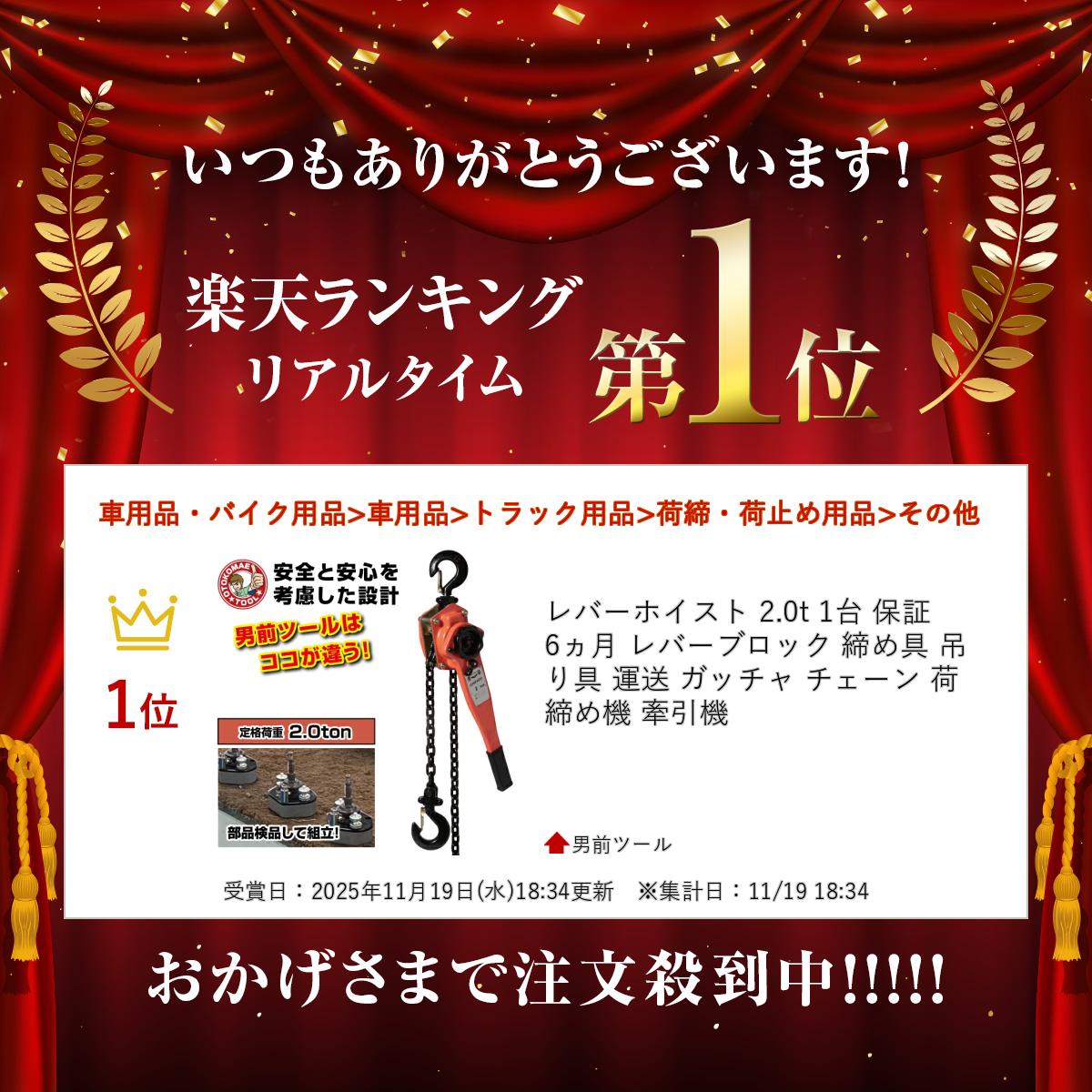 男前ツールは「○○セットのご注文でさらにお得!」などは一切せず、自信をもってお勧めする商品を単品でベストの価格でご提供いたします! 是非一度お試しください! 【商品特徴】 ●早戻しが簡単!作業効率も一段とアップ! 無負荷時に切り替えレバーを中央の位置(N)にするだけでフリーになり、チェーンを引っ張るだけで左右の長さ調節ができます。 2本のチェーンを握って、ハンドホイルを回すだけ。よりスムーズで高効率操作性を実現、プロの現場を快適にサポートして、心強い味方です。 ●国際標準化機構ISO9001:2008認証工場で生産された国際基準CE&TUV&GS規格製品です。 ●日本国内で耐久試験を実施! メーカーでの製品試験はもちろん、日本国内でも実施! 破断荷重試験においてJISB8819に定められた数値を大きくクリアいたしました。 注:JISは未取得 ●進化した男前 レバーホイスト! 品質改良を重ね、以前のレバーホイストより性能がアップ! 耐荷重がアップしたのはもちろん、ブレーキシステムの改良など随所に改良を加えています。 【用途】 ●重量物配送の荷締め ●鉄骨の歪み取り ●大型機械や重量物の引き寄せ ●建築物の芯だし ●板金塗装のフレーム修正 ●山林業や果樹園での原木搬出・抜根・杭抜作業 景石・柱石・ヒューム管などの据付作業 運輸・橋梁・建設・土木・造船・林業などの荷揚げ・揚重・現場作業 【商品名称】 ●レバーホイスト ●チェーンブロック ●ガッチャ 【商品仕様】 ●定格荷重:2.0ton ●揚程:1.5m ●手動力:280N ●作動荷重:約3.0t ●フック間最小距離:380mm ●チェーン掛数:1本 ●重量:11kg ●生産物賠償責任保険 PL保険加入商品 ●保証期間:6ヶ月 ※納品書が保証書代わりとなりますので、必ず無くさないように保管して下さい。 紛失した場合、保証ができかねますのでご了承ください ※使用状況によっては保証対象外となる場合がございますので返送前に必ずお問い合わせください。 【発送に関して】 ●11時までのご注文は即日出荷(土日祝、弊社指定休業日を除く。) ※在庫切れの場合はその限りではございません。 ●送料:1回のご注文につき600円(税別)の送料をご請求いたします。 ※沖縄・離島は別途見積もりとなります。 ※メーカー直送の商品は各商品ページにてご確認ください。 ※ご使用の前に付属の取り扱い説明書を熟読し、機器の知識・安全の情報そして注意事項について習熟してから正しくご使用ください。 ※商品改良において、無断に外観、仕様等の変更する場合がございますので、予めご了承ください。男前ツールから最強のレバーホイスト を超破格でご提供! 男前ツールのおすすめ!この安価が嬉しいレバーホイストです! 安心・安全をモットーに販売しておりますのでご安心してがっつりと ご使用ください! ・メーカー出荷前、規定荷重の1.5倍で強度検査を行います。 ※商品の安全係数は4倍となります。 ・国内の測定機関のほうでも破断試験を行い、確実な安全性に拘ってます。 ・破断荷重試験においてJISB8819に定められた数値を大きくクリアいたしました。注:JISは未取得