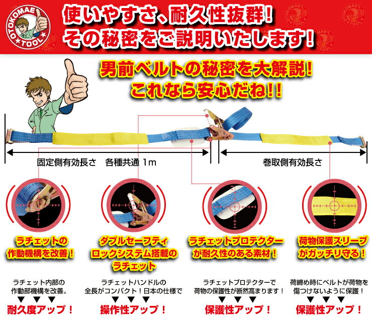 男前ツールは「○○セットのご注文でさらにお得!」などは一切せず、自信をもってお勧めする商品を単品でベストの価格でご提供いたします! 是非一度お試しください! 先端がワッカ(Iフック)タイプのラッシングベルト。 平ボディーのロープフックなどに引っ掛けて使用します。 固定側有効長さ1m・巻取り側有効長さ5m・7mタイプです。 【共通仕様】 ●破断荷重:2000kg ●ベルト幅:50mm ●固定側有効長さ:1m ●プロテクター付 ●スリーブ2枚付 ●PL保険加入商品 【発送に関して】 ●11時までのご注文は即日出荷(土日祝、弊社指定休業日を除く。) ※在庫切れの場合はその限りではございません。 ●送料:1回のご注文につき600円(税別)の送料をご請求いたします。 ※沖縄・離島は別途見積もりとなります。 ※メーカー直送の商品は各商品ページにてご確認ください。 ※商品改良において、無断に外観、仕様等の変更する場合がございますので、予めご了承ください。男前ツールから最強ラッシングベルト を超破格でご提供! 男前ツールのおすすめ!この安価が嬉しいラッシングベルトです! 安心・安全をモットーに販売しておりますのでご安心してがっつりとご使用ください! 出荷前に規格ごとに破断試験を行い、商品の安全性をきっちりと確認しております。 運搬する荷物をしっかりと固定して、荷崩れ・損傷などのトラブルを防ぐ用途に最適なのが ラッシングベルト・ベルト荷締機。ラッシング、ガッチャ、ベルト荷締機などの呼称で親しまれています。 荷造り作業者、積み降ろし作業者、運転手など、業務に携わる全ての人間の安全を守るという役割も 果たしています。