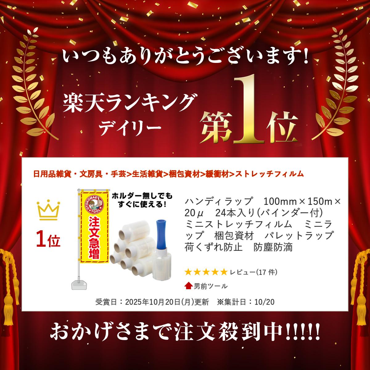 ホルダーいらずですぐに使える!段ボールや商品の梱包に便利です! サッと梱包したい時に便利なハンディタイプのストレッチフィルム。 24本セットでこの価格が嬉しい一品です! 【ハンディラップ 仕様】 ●寸法:幅100mm×長さ150M ●厚み:20ミクロン ●材質:LLDPE(ポリエチレン) ●伸び率:358% ●引張強度:約31Mpa ●質量:約340g ●持ち手部分:約4cm 【バインダー 仕様】 ●サイズ:26cm ●重量:64g ●材質:PP ※バインダー無しでも使用可能です。 ※ストレッチフィルムは生産ロットにより 右巻きと左巻きの商品が混在する場合がございます。 (品質・使用上の問題はありません。) ※右巻き・左巻きの指定は出来かねます。 予めご了承下さいますようお願い申し上げます。 【発送に関して】 ●11時までのご注文は即日出荷(土日祝、弊社指定休業日を除く。) ※在庫切れの場合はその限りではございません。 ●送料:1回のご注文につき600円(税別)の送料をご請求いたします。 ※沖縄・離島は別途見積もりとなります。 ※メーカー直送の商品は各商品ページにてご確認ください。 ※商品改良において、無断に外観、仕様等の変更する場合がございますので、予めご了承ください。男前ツールから最強ハンディラップ を超破格でご提供! 男前ツールのおすすめ!この安価が嬉しいハンディラップです! 安心・安全をモットーに販売しておりますのでご安心してがっつりとご使用下さい ・20μの厚みで強度抜群!紙管を長めに設計しているのでそのままでもOK! ・原材料は超一流エクソンモービル製! ・11時までのご注文は当日で出荷いたします 在庫切れの場合は除きます