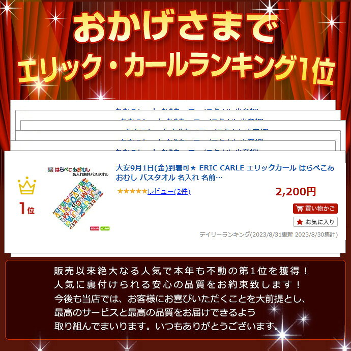 大人気な"はらぺこあおむし"のアイテム♪ カラフルな色使いとデザインでわくわく楽しくさせてくれます★ ジャガードタイプで吸水性もバッチリで肌触りもバツグンです!! 保育園やプールなどで大活躍!! ■サイズ:60×120cm ■納期について 「即日発送(最短お届け)」対象商品でございます。 ■のし紙について 短冊のしでございます。 予めご了承くださいませ。 ■メッセージカードについて 約40文字程度を目安にご希望の文章を備考にご記載くださいませ。(それ以上の文字数でも印刷は可能ですが、文字が小さくなってしまう可能性があります) いただきました文章は印刷をし、ラッピングに添えさせていただきます。 ■ラッピングについて 有料でございます。 お気軽にご注文ください。 ■ こんなギフトのタイミングにオススメ ■内祝い・出産内祝い・結婚内祝い・快気祝い・全快祝い快気内祝い・御祝い・結婚式・引き出物・結婚祝い結婚内祝い・引越しご挨拶・敬老の日・入学内祝い 初節句・新築内祝い・お祝い・結婚記念日贈り物・就職祝い・お年賀・お返し粗品・記念品・二次会・景品・コンペ・プレゼント・誕生日お中元・お歳暮