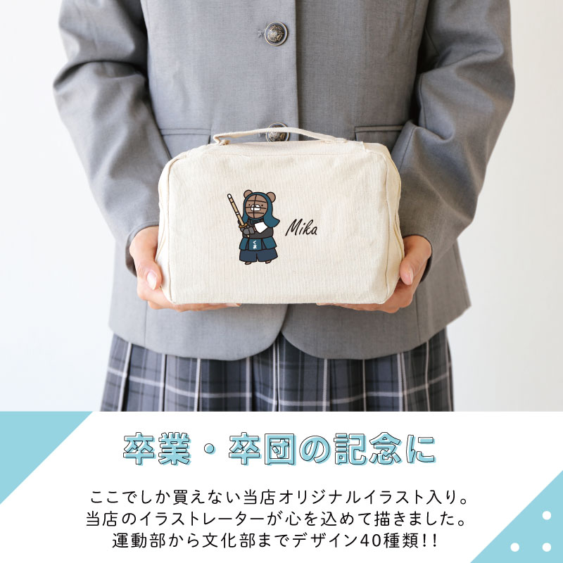 サイズ 約 幅20cm×高さ14cm×奥行9cm 素材 コットン製 名入れ プリントするお名前は「入力欄」へご記入下さい。 ローマ字のみ ※日本語不可 文字数は10文字までとさせていただきます 関連商品 ■スクエアポーチ - くま部 - ■スクエアポーチ ‐ 部活 アイコン - 商品情報 \ 青春の思い出をクマと一緒に! / ○○しているクマが可愛い♪ 運動部 から 文化部 まで豊富な全40種類 ここでしか買えない当店限定のオリジナルのくまちゃんデザイン! 卒業記念 卒団記念 の贈り物にピッタリな くま部 ポーチです。 1. 当店オリジナル くま部 デザイン 当店専属のイラストレーターが作成した、 ここでしか手に入らないオリジナルのくまデザイン! 全40種類のバリエーションで、運動部・文化部 に幅広く対応。 あなたの所属している部活もきっと見つかるはず♪ クラブ仲間や、友達への贈り物にもぴったりです。 部活の思い出をぎゅっと詰め込んで、 いつも身近に感じられるアイテムを手に入れてみてはいかがでしょうか? ≪ 部活 全40種類≫ テニス部 / バスケ部 / 陸上部 / バレー部 / 剣道部 / チア部 / ダンス部 / 書道部 / 美術部 /写真部 / 放送部 / 料理部 / 帰宅部 / 弓道部 / バドミントン部 / 卓球部 / サッカー部 / ハンドボール部 / ラグビー部 / ソフトボール部 / フェンシング部 / レスリング部 / パソコン部 / 園芸部 / 茶道部 / 柔道部 / バレエ部 / 野球部 / スケボー部 / 登山部 / 科学部 / 和太鼓部 / 新体操部 / 器械体操部 / 花道部 / ホッケー部 / かるた部(百人一首)/ 水泳部 / 音楽系の部活 / 演劇部 2. 実用性に優れた スクエアポーチ ガバッと開くスクエア型だから中身が見やすく収納力バツグン! 持ち手付で 持ち運びもしやすく、 大容量 で 実用的 な ポーチ です ハンドタオルや常備薬など、合宿 や 遠征 に必要な持ち物を収納したり、 旅行 や お出かけ などにも便利 です。 - こんな使い方がおすすめ - ・ 化粧品やメイク道具 を入れて コスメポーチ として ・ 衛生的に持ち歩きたい マスク や 消毒液 などの 除菌グッズ を入れるケースとして ・ 充電ケーブル イヤホン スピーカー モバイルバッテリー などの スマホ周辺機器 をまとめて収納する ガジェット ポーチ として ・ シャンプー・リンスや歯ブラシなどのお泊りセットを入れて トラベルポーチ として ・ ぬい や アクスタ をいれて 推し活 グッズ として 3. お名前プリント 名入れギフト専門の当店スタッフが心を込めてお名前をプリントいたします。 「 どうして名前入りが喜ばれるの? 」 普段あまりにも身近にあるので、自分の名前のことを深く考えることはありませんが 贈られた商品に自分の名前が刻まれていたらどうでしょう。 しかも特殊な技法で彫り込まれていたり素敵なデザインとなってプリントされていたり・・ その瞬間、ただの“商品”ではなく“自分だけの大切なもの”に変化します。 そして贈ってくれた方の真心を感じ、自然に笑顔がこぼれることでしょう。 名前はその人にとって唯一無二、かけがえのないものです。 私たちはそのお名前を大切に、贈る人、贈られる人、両方の笑顔を想いながら商品を送り出します。 当店の名前プリントはずっと消えずに残り、永く愛着を持ってお使いいただけることでしょう。 ≪ こんなシーンにおすすめ ≫ ・ クラブ活動 チーム 部活動 スポーツ少年団 サークル ・ ミニバス ミニバスチーム ・ 大会 セレモニー 卒部式 卒団式 ・ 引っ越し する友達へ プレゼント に ・ 学校 小学生 中学生 高校生 の女の子に ・ 入学祝い 卒業祝い の 記念品 に ・ マネージャー 後輩 先輩 引退記念 ・ 部活 クラブ を 卒業 引退する 部員 への 卒団記念品 に