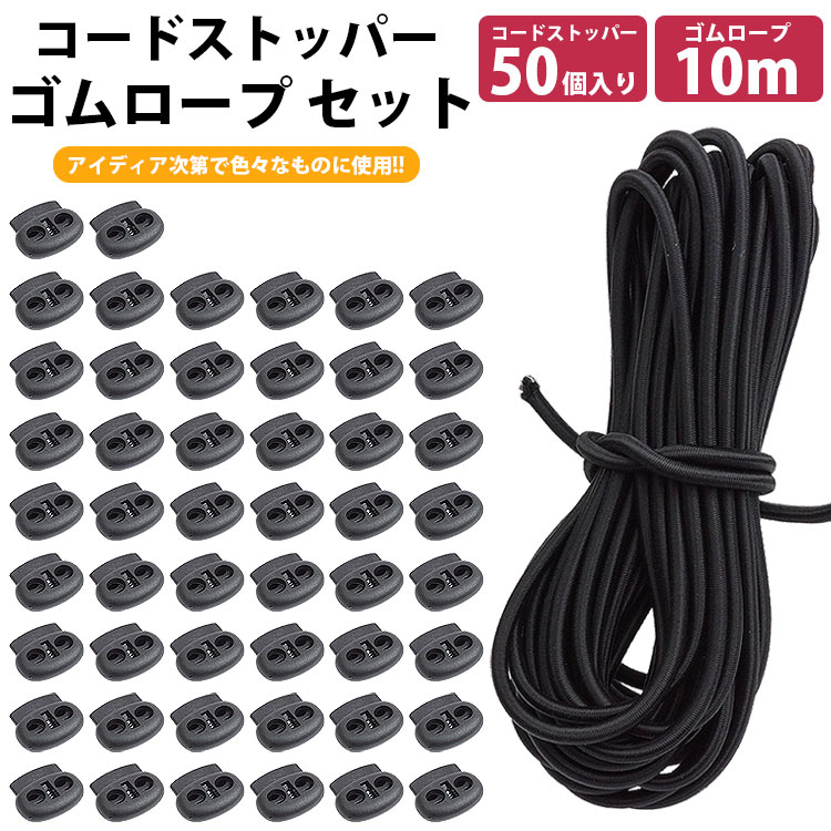 ゴムロープ 5mm 10m コードストッパー 50個 セット ゴム紐 丸ゴム 伸縮性 カット 紐止め 手芸 アウトドア 簡単取付 PR-R5010BP50-L