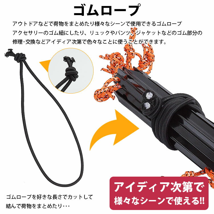 ゴムロープ アウトドアなどで荷物をまとめたり様々なシーンで使用できるゴムロープ アクセサリーのゴム紐にしたり、リュックやパンツ、ジャケットなどのゴム部分の修理・交換などアイディア次第で色々なことに使うことができます。 高伸縮性 複数の小さいゴムが芯になっており、表面をポリエステル系素材が包んだゴムロープ ゴムで伸縮性があるので、伸ばして荷物などを簡単にまとめることができます。 長さ10m ゴムロープの長さは約10mなので、様々な用途にお使い頂けます。 また、ハサミで簡単にカットすることも可能です。 コードストッパー 衣類やバックパック・靴紐等の紐に取り付けて長さ調整などに便利!! アウトドア用品や手芸・DIY等アイディア次第で色々なものに使うことができます。 50個入り コードストッパーはたくさん使える50個入りです。 簡単取付 コードストッパーのバネ(突起)部分を押しながら穴に紐を通すだけの簡単取付。 【ゴムロープ】 長さ(約):10m 太さ(約):5mm 材質:ゴム、ポリエステル 重量(約):172g (10m) 製造国:中国 【コードストッパー】 サイズ(約):縦20mm×横22mm×厚6mm 穴直径(約):5mm 材質:プラスチック 入数:50個 重量(約):1g (1個あたり) 製造国:中国 【注意事項】 ※ゴムロープの長さは個体差で若干前後する場合が御座いますのでご了承ください。 ※撮影用の小物は付属しておりません。 ※カットした端はほつれないようにライター等の火で炙って処理してください。 ※ゴムロープの先端がほつれていたり、ゴムが膨れているとエンドストッパーに入れにくいのでご注意ください。 ※若干のサイズや重量の誤差はご了承ください。 ※画像・イラストはイメージです。ご閲覧の環境により、色味や雰囲気は異なります。 ※ご閲覧の環境等により、色味などが実際の商品と異なって見える場合がございます。 ※輸入商品の為、製造や輸送の際に生じる若干の小傷や汚れ等がある場合が御座います。 ※仕様は改善の為に予告なく変更する場合があります。 ※メール便での発送は(ポスト投函)代金引換、日付指定やあす楽の対応はできませんのでご了承ください。