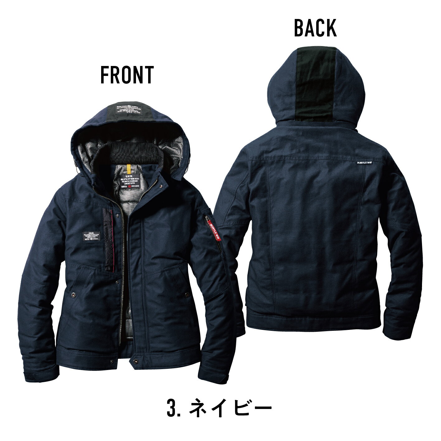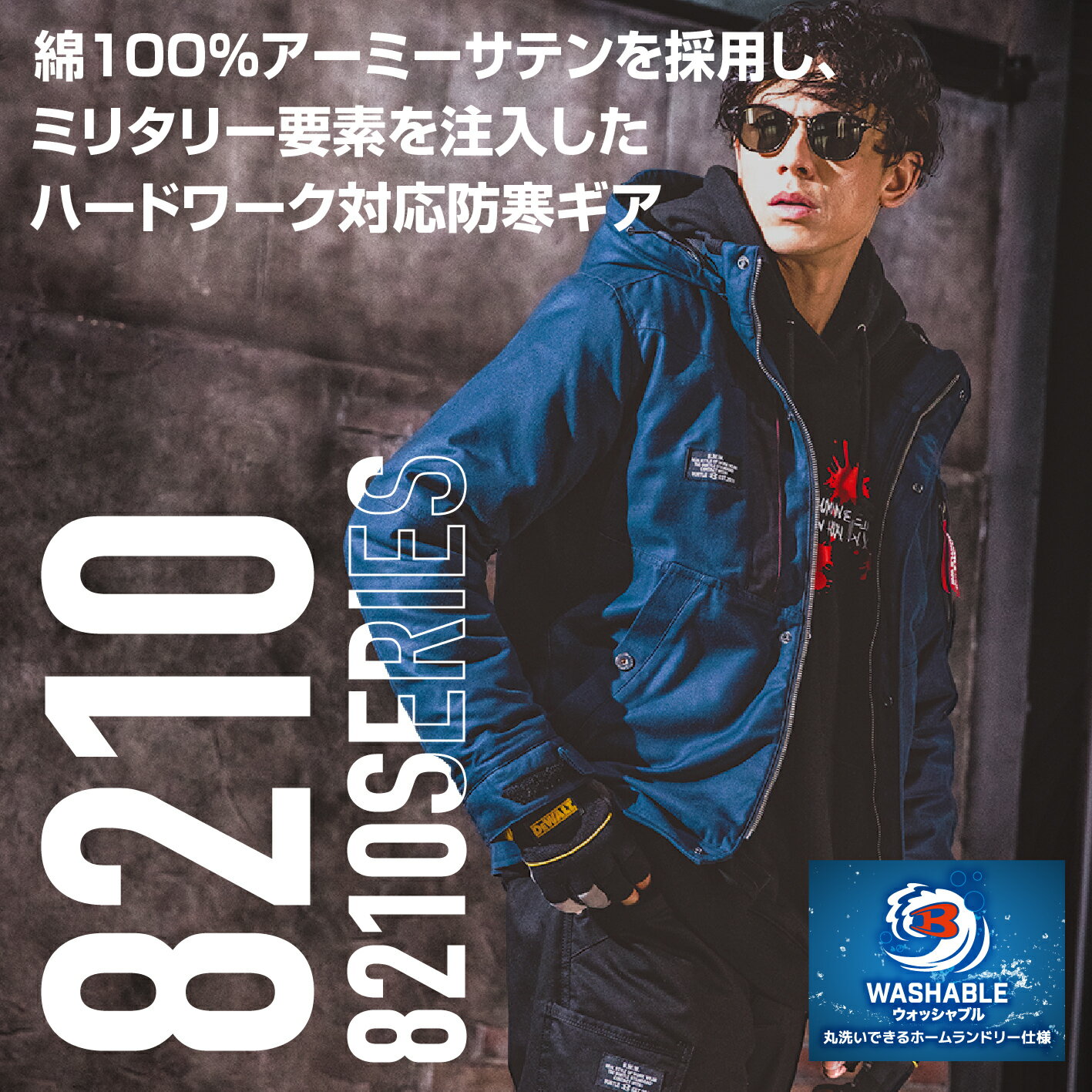 【メーカー】バートル 【品番】8210 【商品名】防寒ジャケット(大型フード付き) 【素材】 表地:高密度アーミーサテン、強撥水加工 裏地:アルミメッシュラミネート加工(保温性) 【混率】 表地:綿100% 裏地:ポリエステル100% 【詳細】 ・サーモクラフト装着対応モデル ・耐久性があり、滑らかな表面感のバックサテンは ミリタリー王道ファブリック ・保温性のあるアルミメッシュを内側に備え、 電熱パッドとの併用で抜群の保温力を追求 ・一般家庭洗濯に対応したウォッシャブル仕様により イージーケアを実現 ・男女ユニセックスの着用に対応 ※モニターによって発色が異なる場合があります