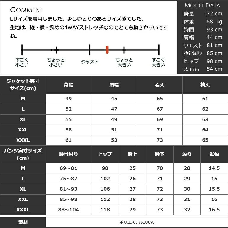 ▼関連キーワードゴルフウェア メンズ セットアップ 冬 パンツジャケット 防寒 暖か 秋 防風 ボトム トップスフルジップ スポーツウェア アウター おしゃれ3層構造で寒風をシャットアウト裏フリース防風ゴルフセットアップ 同素材のセットアップが組めるからおススメです! 同色のセットアップですが全く違和感なくお洒落に簡単にコーディーネートができるので冬場のプレーが楽になりますよ。 ダボっとせずシルエットがキレイなので、スタイリッシュにプレーできると思います。 3層構造で寒風をシャットアウトするから暖かい! 一番の特長は「防風タイプ」のあったか仕様であること。これはどういうことかというと表生地・防風フィルム・裏地フリース素材の3枚のパネルから構成された3層構造になっているんです。なので、寒風をシャットアウトしてくれるから、モコモコしない薄手タイプなのに暖かいんです!ものすごくは伸びませんがストレッチ性があるのでスイングして突っ張る感覚はないですね。さらに裏地に肌触りのいいフリース生地を使っているので暖かいので寒い季節でもスコアアップが望めますよ! ACCESSORYバランスe ドラコンネックレスJACKET単品 フリース防風ゴルフブルゾン BOTTOMS単品 裏フリース防風ゴルフパンツ INNER単品 バックロゴポンチプルオーバー SETUP2点セット 裏フリース防風ゴルフセットアップACCESSORYバランスe ドラコンネックレスJACKET単品 裏フリース防風ゴルフブルゾン BOTTOMS単品 裏フリース防風ゴルフパンツ INNER単品 フリース素材防寒モックネックインナー SETUP2点セット 裏フリース防風ゴルフセットアップACCESSORYバランスe ドラコンネックレスJACKET単品 フリース防風ゴルフブルゾン BOTTOMS単品 裏フリース防風ゴルフパンツ INNER単品 バックロゴポンチプルオーバー SETUP2点セット 裏フリース防風ゴルフセットアップ ★レビュー投稿で500円クーポンプレゼント! ご購入頂いた商品について皆様の声をお聞かせくださいませ。今後の品備え、ショップ作りの参考にさせていただきます!