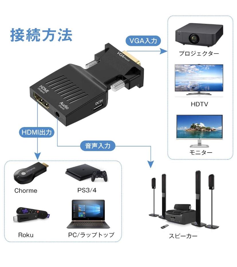 VGA HDMI 変換 VGA to HDMI 変換アダプタ VGAオス - HDMIメス コンバーター 音声転送 1080Pビデオ出力 パソコン プロジェクター HDTV 用 VGA-HDMI 変換ケーブル 給電用Micro-USBケーブルと3.5mmオーディオケーブル付き