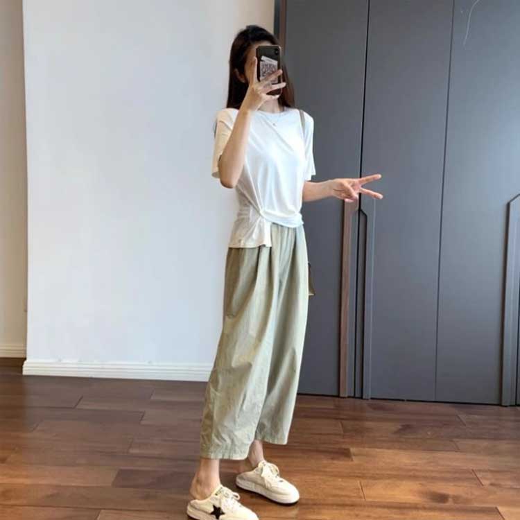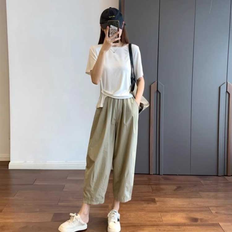 着 ロング丈 おしゃれ 無地 ワイドパンツ 大人 春夏 パンツ レディース 薄手 パンツ クロップドパンツ ウエストゴム 夏服 9分丈